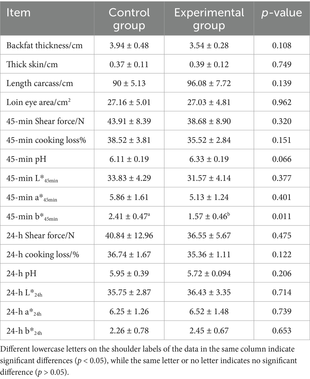 The PH (45 min and 24 h), meat color (45 min and 24 h), drip loss (45 min and 24 h), shear force (45 min and 24 h), and cooking loss (45 min and 24 h) of the longissimus dorsi muscle post-slaughter were measured according to NY/T821-2004 “Technical Specification for Determination of Pork Muscle Quality” and the relevant methodologies outlined in “Swine Production Science.”