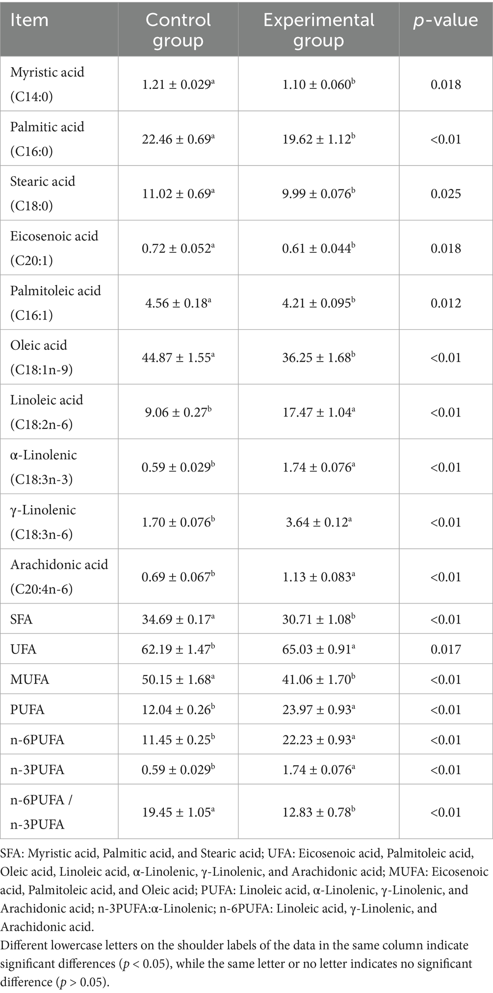 Myristic acid, stearic acid, cis-11-eicosenoic acid, palmitoleic acid, and oleic acid contents were significantly decreased (p < 0.05), while palmitic acid content was markedly reduced (p < 0.01). Conversely, linoleic acid, α-linolenic acid, γ-linolenic acid, and arachidonic acid contents were dramatically elevated (p < 0.01).