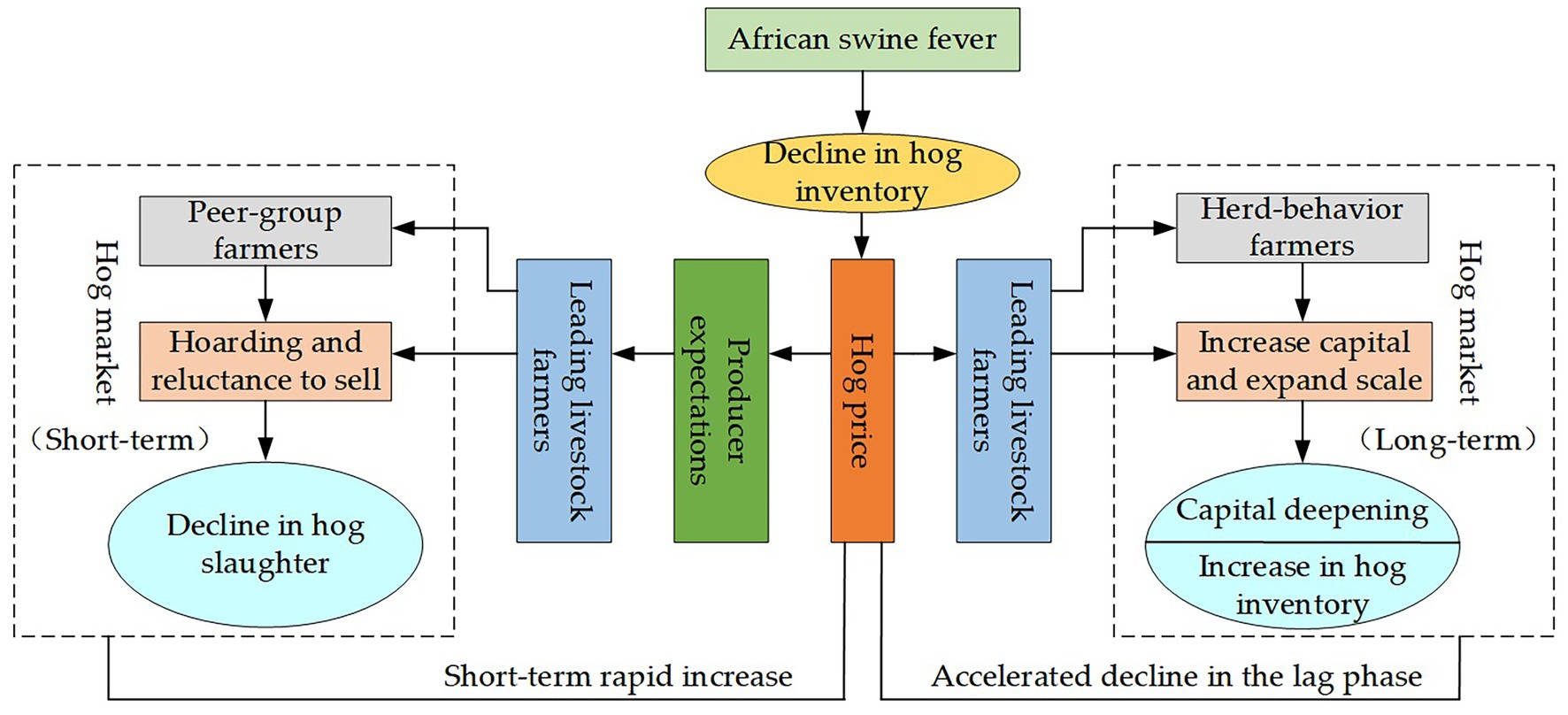 China is a major producer and consumer of pork, and the hog industry plays a pivotal role in safeguarding national food security, increasing farmers’ income, and promoting rural economic development. However, since the beginning of the 21st century, frequent outbreaks of swine diseases have occurred in China. The African swine fever (ASF) outbreak in 2018, in particular, exhibited high virulence and strong environmental resistance. It spread through multiple pathways, and no effective vaccine was available for prevention. Characterized by high mortality and high infectivity, the disease not only caused significant losses for many farmers but also altered the industrial structure and market dynamics of China’s hog farming sector, leading to severe impacts on the industry (1). Statistical data indicate that by the end of August 2019, 147 outbreaks of ASF had been reported across all 31 provincial-level regions in China1. And approximately 1.2 million pigs were culled by the end of that year. This led to a 27.5% year-on-year decrease in the national live hog inventory compared to 20182, and the hog industry has witnessed an unprecedented fluctuation in production capacity. By the end of 2023, the top 20 large-scale swine enterprises in the country accounted for 27.4% of the total hog output, representing a 16.7 percentage point increase from 20193, which reflects further capitalization in the hog industry. In Das Kapital, Marx proposed that the process of transforming surplus value into capital is termed capital accumulation (2). Capitalization, as an extension and deepening of capital accumulation, refers to the process of converting various equities and assets into capital. Building upon this concept, hog farming capitalization denotes the transformation of inputs or resources in hog production into long-term assets or capital, with its most direct manifestation being the scaling-up of hog farming operations. In pursuit of surplus value, capital-intensive hog farms increase capital input to replace traditional labor factors of production. This essentially reflects the practical application of Marx’s theory of the organic composition of capital in the hog industry. Particularly since the outbreak of ASF, a large number of small-scale farms withdrew from the market due to unprofitability (3). In contrast, larger capitalized farms, benefiting from greater financial resources, technological capabilities, and managerial advantages (4), exhibited higher resilience to the epidemic’s impacts. The proportion of market hogs supplied by farms with an annual output of fewer than 500 head dropped sharply from 57% in 2017 to 35% in 20224. This shift represented a production capacity transfer of approximately 150 million head. The exit rate of small-scale farmers averaged about 7.4 percentage points per year, far exceeding the natural attrition rate. Consequently, the ASF outbreak has objectively accelerated the capitalization process in hog farming. Against this backdrop, examining the accelerating effects and underlying mechanisms of ASF on hog farming capitalization holds substantial practical significance.