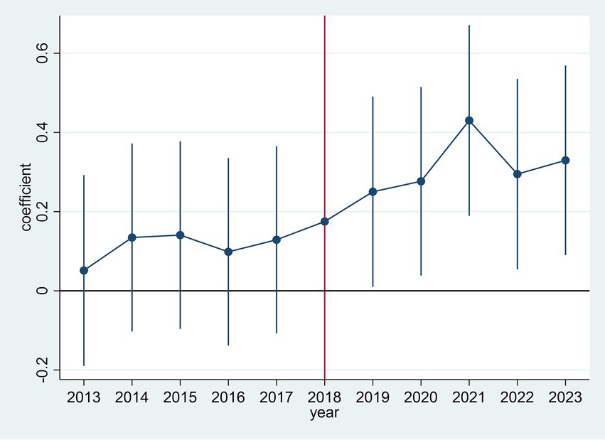 The parallel trend assumption posits that, in the absence of intervention, the treatment group would have followed a similar trend as the control group. Following the methodology of Lu et al. (31), we conducted parallel trend tests to examine the dynamic effects of ASF outbreaks on hog farming capitalization. Figure 2 shows parallel trend test result. As illustrated in Figure 2, the regression coefficients of interaction terms for the five pre-treatment periods and the outbreak period itself are statistically indistinguishable from zero. However, these coefficients become significantly positive in the post-outbreak periods. This indicates that before the outbreak of ASF, there was no significant difference in the process of piglet breeding capitalization between the experimental provinces and the control provinces. This satisfies the parallel trends assumption, meeting the prerequisite for employing a difference-in-differences analysis.