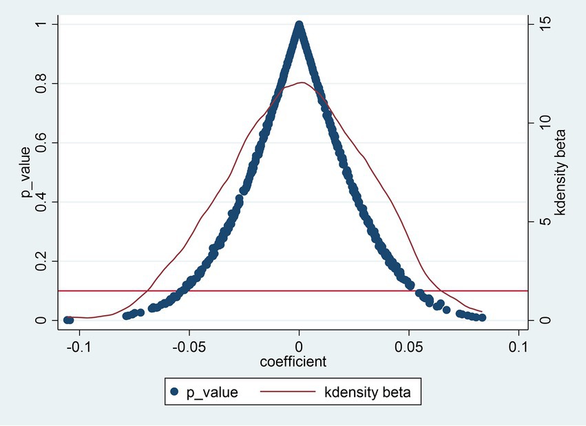 To eliminate the interference caused by omitted variables and unobserved factors, and to ensure that the conclusion drawn in the previous part is due to the outbreak of ASF, this study conducts a placebo test. The underlying rationale involves randomizing the treatment and control groups and then re-estimating the baseline regression. If the key coefficient remains statistically insignificant across numerous randomizations, it suggests that the observed effect of the core explanatory variable is not due to random chance. This study followed the approach of Lu et al. (32), constructing interaction terms in the sample provinces and conducting 500 sampling tests to perform a placebo test. The placebo test results are shown in Figure 3. It can be seen from this that after 500 sampling regressions, the estimated coefficients of the core explanatory variables follow a normal distribution, and most of the p-values are greater than 0.1. This indicates that randomizing the occurrence of ASF yields no statistically significant effect, confirming that the positive impact of ASF on hog farming capitalization is robust and not attributable to spurious correlations. Thus, the placebo test validates our baseline findings.