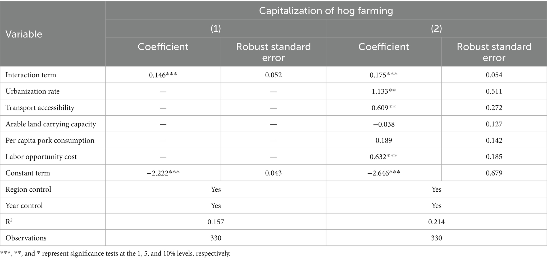 To verify the robustness of the research conclusions, this study conducts robustness tests by replacing the explained variable. Generally speaking, large-scale hog farms exhibit higher capital intensity; thus, the number of such farms can, to some extent, reflect the capitalization status of the hog industry. In accordance with the National Modern Agricultural Development Plan (2011–2015), which uses the proportion of farms with an annual output of 500 heads or more relative to the total number of farms as a measure of farming scale, this paper defines farms with an annual output of 500 heads or more as capitalized farming operations. Therefore, the explained variable is replaced with the proportion of capitalized farms, specifically the proportion of hog farms with an annual output of 500 heads or more. Consequently, the capitalization rate of hog farming is calculated as follows: