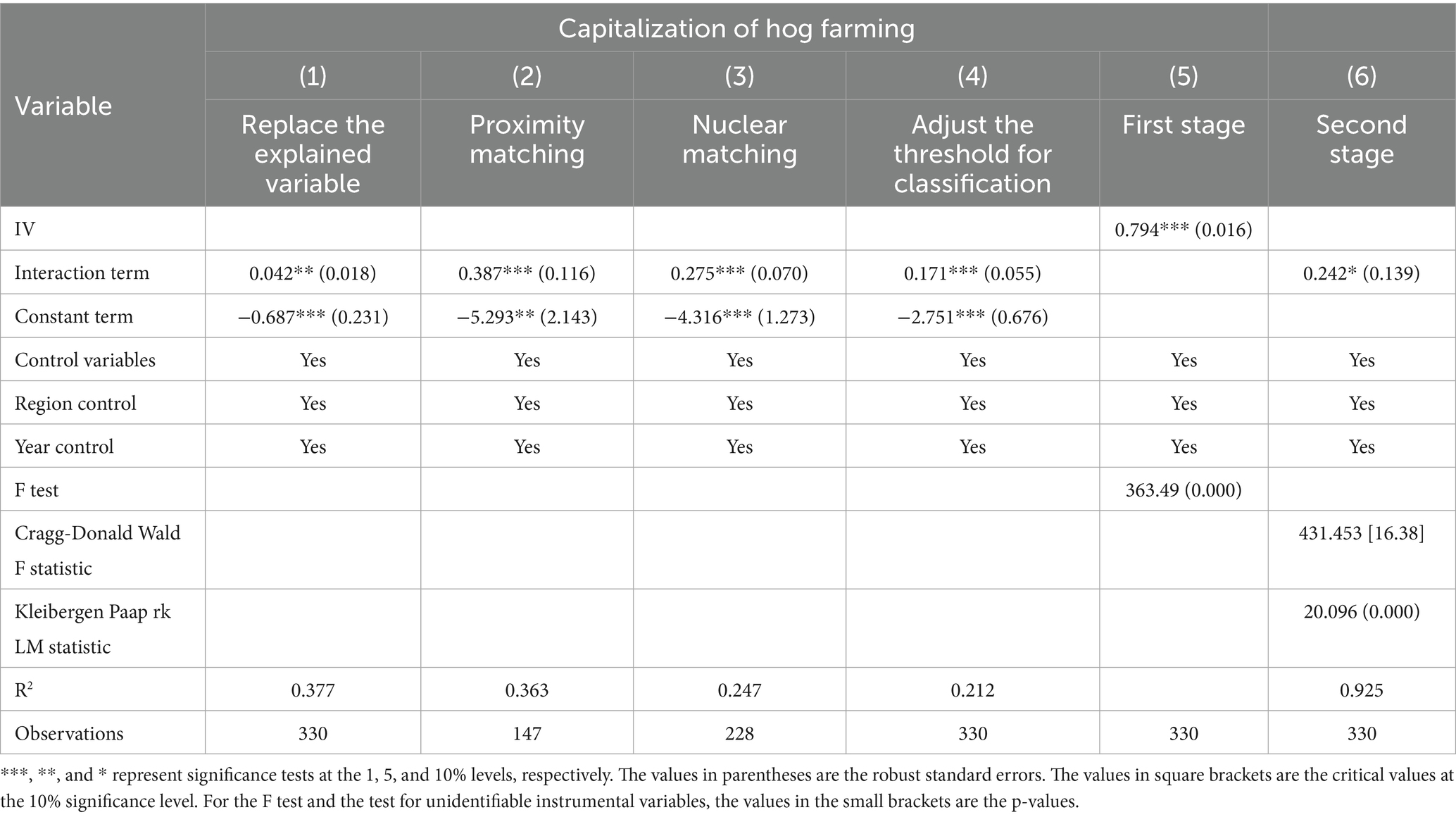 To examine potential endogeneity between ASF and the capitalization of hog production, this study adopts the methodology of Li and Li (33), employing a one-period lagged ASF variable as an instrumental variable (IV) and conducting two-stage least squares estimation. The results are presented in Columns (5) and (6) of Table 3. The first-stage regression confirms that the instrumental variable significantly promotes the capitalization of hog production, with statistical significance at the 1% level. Additionally, both the weak instrument test and the underidentification test support the validity of the chosen IV, further substantiating the robustness of our empirical approach. Therefore, after addressing potential endogeneity concerns, we conclude that ASF continues to exhibit a significant positive effect on the capitalization of hog production, reinforcing the reliability of our baseline findings.
