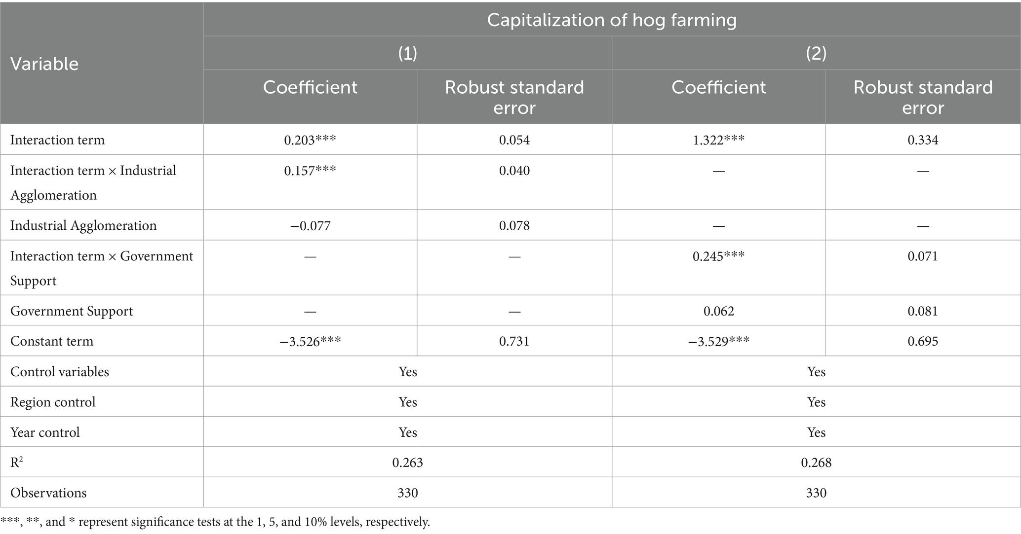 Based on Equation 10, we incorporate government support and industrial agglomeration as moderating variables, along with their interaction terms with ASF, to test their positive regulatory effects on capitalization of hog farming. The specific regression model is as follows: