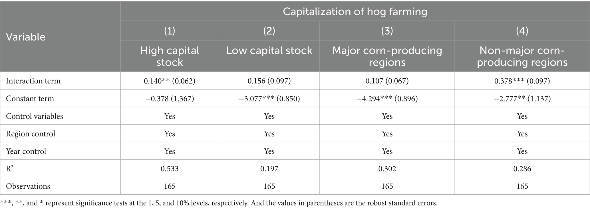 Capital stock serves as a critical indicator for measuring the capitalization of the hog farming industry. To examine whether the impact of ASF on hog farming capitalization varies significantly across regions with different capital stock levels, this study draws on the research methods and parameter settings of Li (34), and uses the perpetual inventory method to calculate the capital stock of the hog farming industry in each region. The sample was then divided into two groups based on the median of the 10-year average capital stock across 30 provinces, followed by group-wise regression analysis. The results, presented in Columns (1) and (2) of Table 5, demonstrate that in regions with higher capital stock, the promoting effect of ASF on hog farming capitalization is statistically significant at the 5% level, whereas no significant effect is observed in regions with lower capital stock. A possible explanation is that regions with greater capital stock typically exhibit higher industrial concentration and possess superior developmental advantages in hog farming, thereby providing a solid foundation for enterprises to accelerate capitalization. In other words, a higher capital stock may amplify the accelerating effect of ASF on hog farming capitalization.