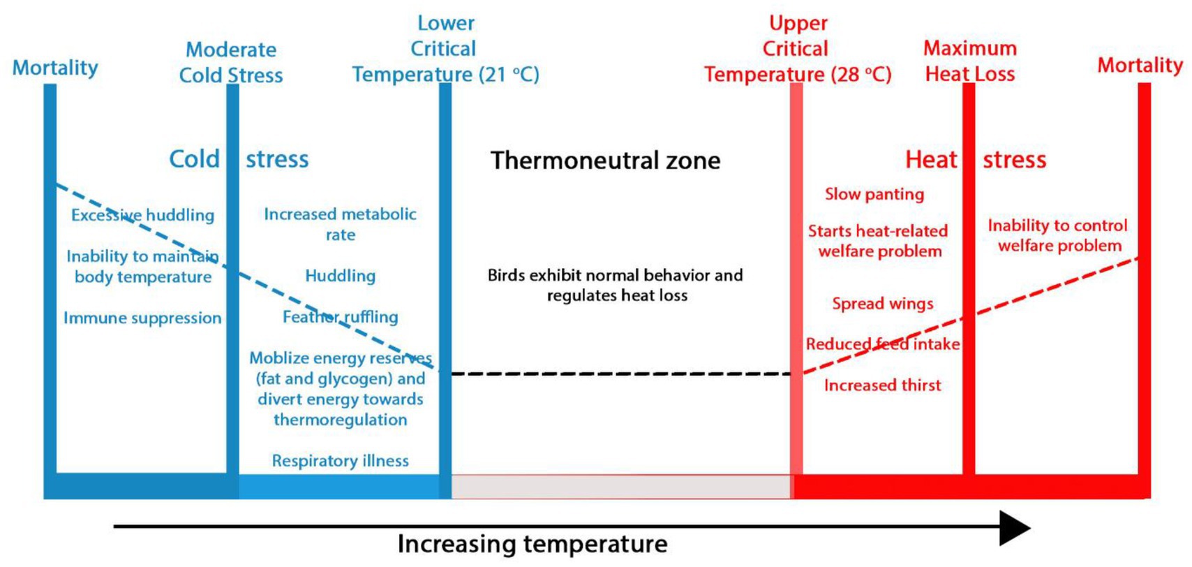 Figure 2. Impact of ambient temperature on poultry behavior and welfare. Within the thermoneutral zone, birds maintain a stable body temperature through physical heat regulation and display normal behaviors. Beyond the lower and upper critical zones, chickens experience cold and heat stress, respectively, leading to welfare issues and even death.