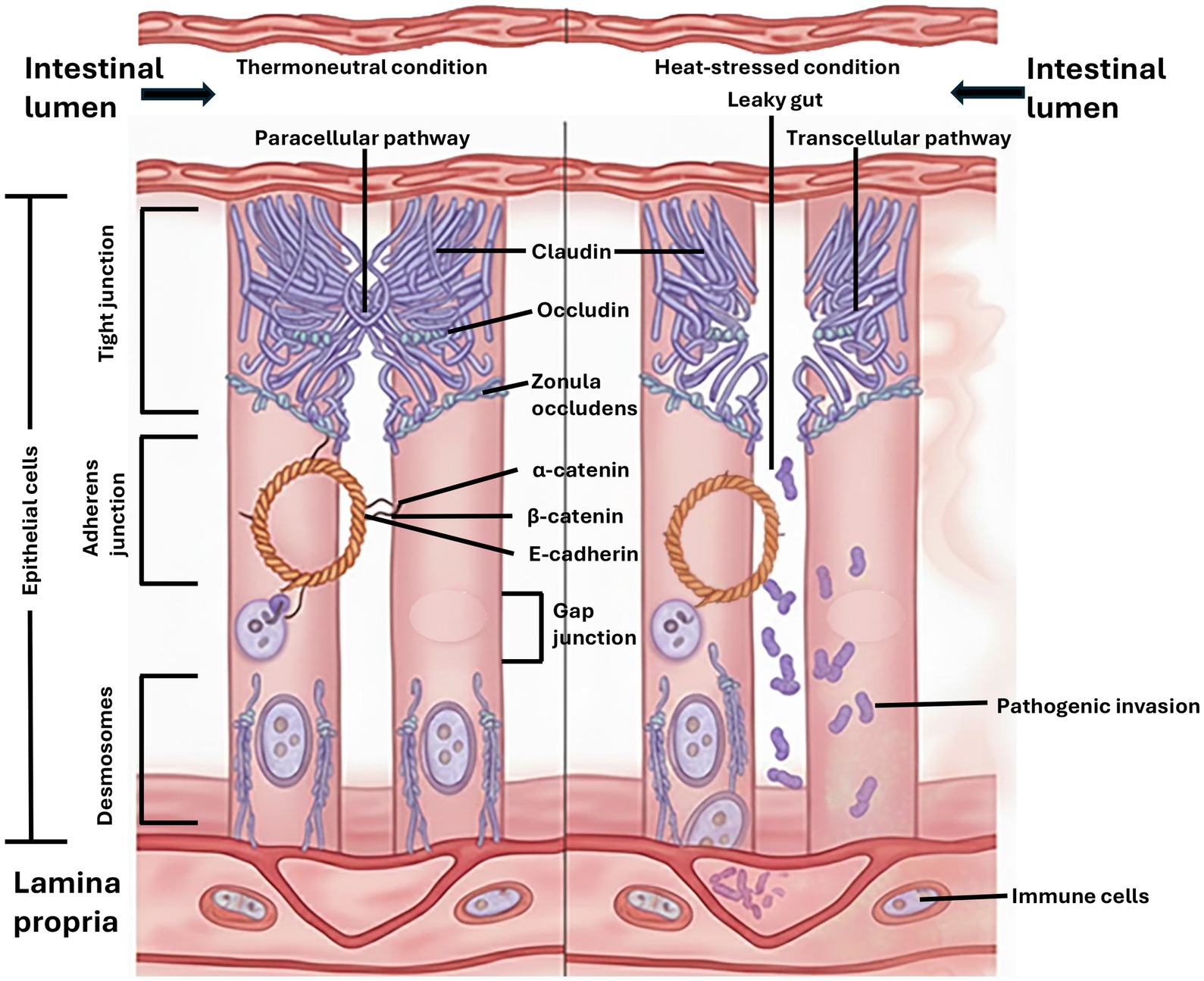Figure 4. Mechanism of heat stress-induced intestinal permeability. Under thermoneutral conditions, the tight and adherens junctions form an intact barrier. Under heat stress, oxidative damage disrupts these junctions, widening the paracellular pathway and leading to the invasion of pathogenic bacteria and endotoxins into the lamina propria, triggering inflammation.