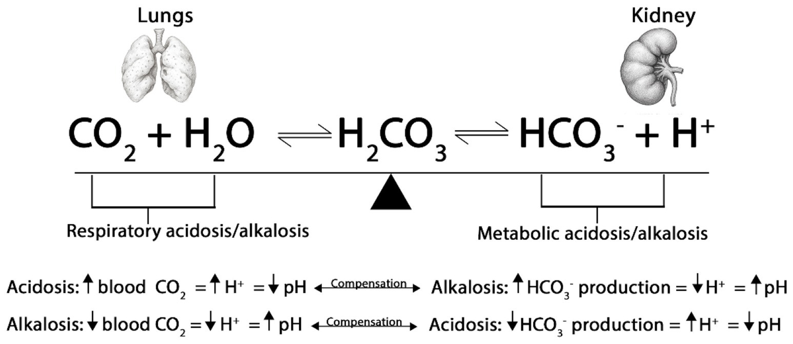 Figure 5. Respiratory and metabolic acidosis and alkalosis. The process of breathing leads to the production of CO2, which subsequently enters the bloodstream. Blood, primarily composed of water, facilitates a chemical reaction when carbon dioxide mixes with it, resulting in the formation of H2CO3. Carbonic acid is unstable and dissociates into HCO3− and H+. Thus, the lungs regulate blood pH by altering the PaCO2, while the kidneys regulate blood pH by altering the concentration of HCO3−. When the pH is too acidic, the kidneys absorb HCO3−, and when it is too alkaline, they excrete HCO3−.