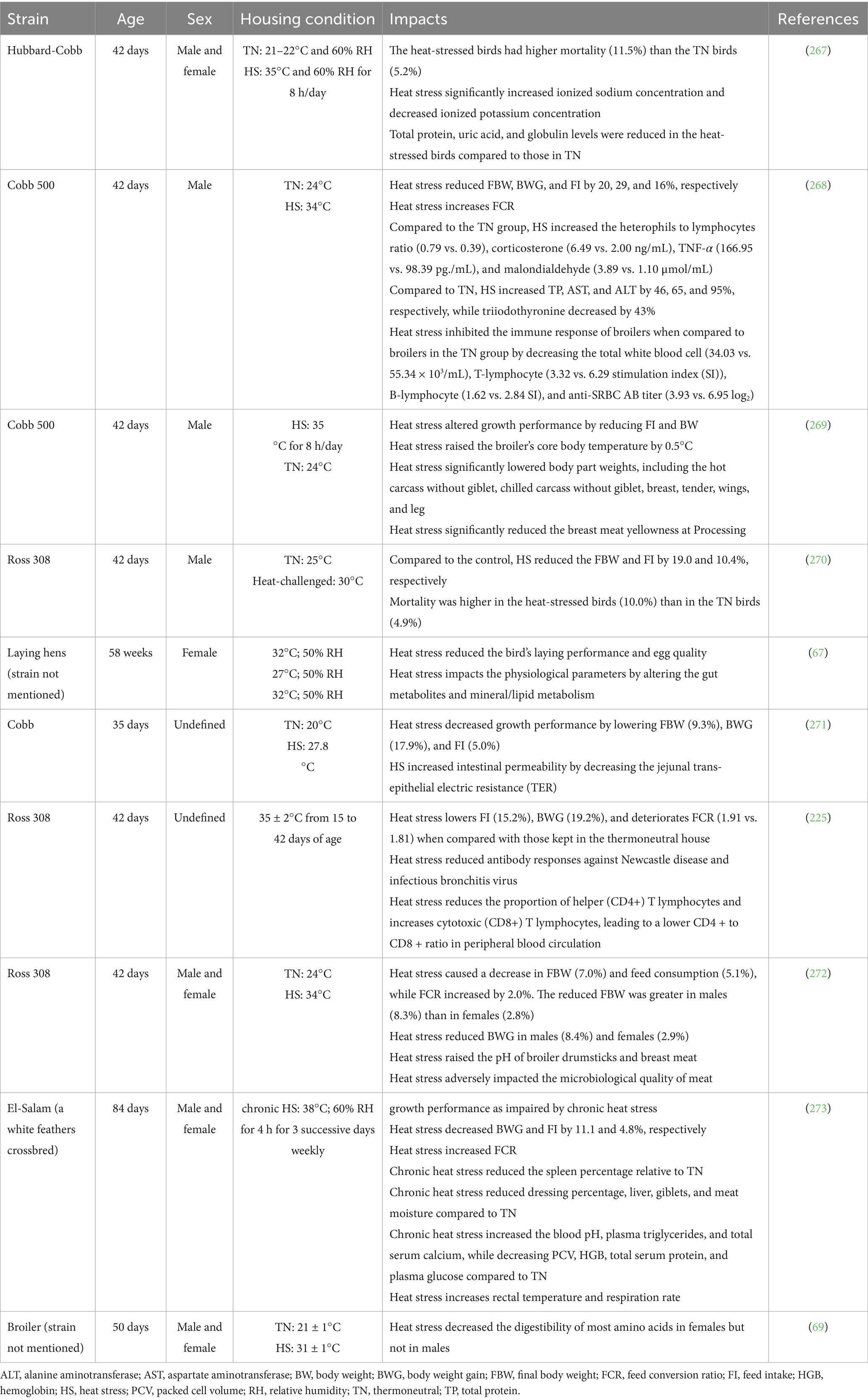 The effects of HS on bird strains and gender, as well as FI and body weight gain (BWG), are shown in Tables 1, 2, respectively. Broilers generate a large amount of heat because of the high energy density in their diets, retaining only 40% of the ingested energy and dissipating the remaining 60% (17). Exposing broilers to chronic HS resulted in 16.4, 32.6, and 25.6% reductions in FI, BWG, and feed conversion ratio (FCR), respectively (28, 50). According to Harsini et al. (51), exposing broilers to a cyclic temperature range of 23.9°C to 37°C significantly reduced BWG and FI, and increased FCR. Likewise, HS in laying hens led to reduced body weight (BW), feed efficiency, and other production metrics (52). The degree to which FI decreases varies based on different factors linked to the HS model applied to birds, complicating comparisons across studies (53). Under HS, birds reduce their FI to allocate more energy to cooling efforts, diverting energy from growth to thermoregulation. In addition to reduced FI, HS reduces the blood supply to intestinal epithelial cells, thereby reducing nutrient and oxygen supply, which in turn causes morphological changes and mucosal damage. This leads to intestinal inflammation, reduced villus height, and intestinal permeability, which impairs nutrient absorption and further contributes to poor feed efficiency and growth performance (54).