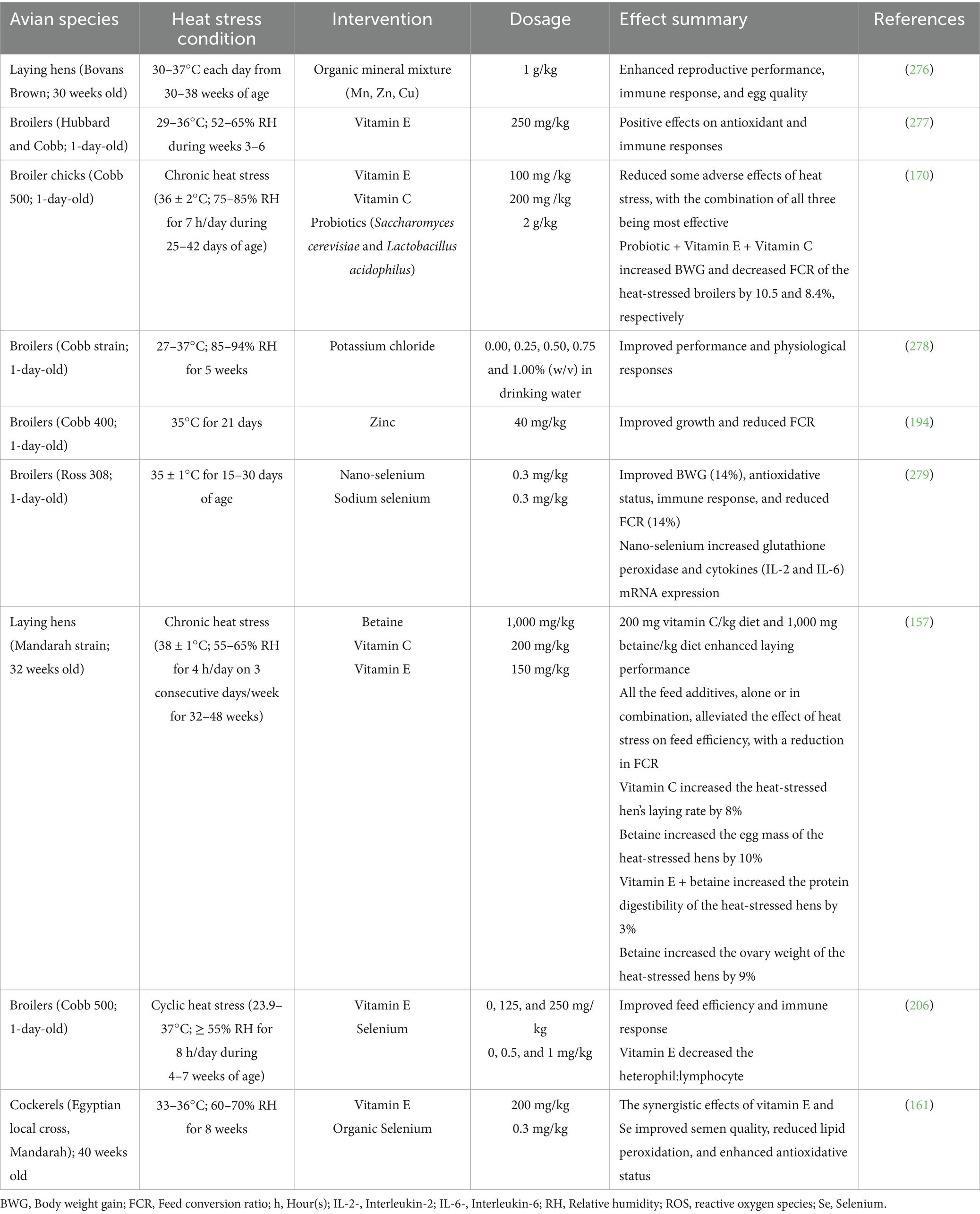 Vitamins play significant roles in improving growth and nutrient utilization in heat-stressed birds (Table 3). Under cyclic HS (36 ± 2°C), broilers fed diets supplemented with vitamin E (100 mg/kg), vitamin C (200 mg/kg), and probiotics enhanced BWG and decreased the FCR of broiler chickens (170). Also, McKee et al. (171) reported that vitamin C (150 mg/kg in diet plus 400 mg/L in water) mitigated the reductions in cockerels’ weight gain, FI, and gain:feed ratio caused by heat exposure. Similarly, dietary inclusion of 100 mg vitamin E/kg enhanced feed utilization in broilers under heat stress, as evidenced by a significant decrease in FCR (172). These observed benefits could be associated with the antioxidant properties of the vitamins. By mitigating oxidative damage and gut permeability induced by HS, they stabilize the cell membranes and improve immune response, improving nutrient absorption and allowing birds to partition more energy toward growth.