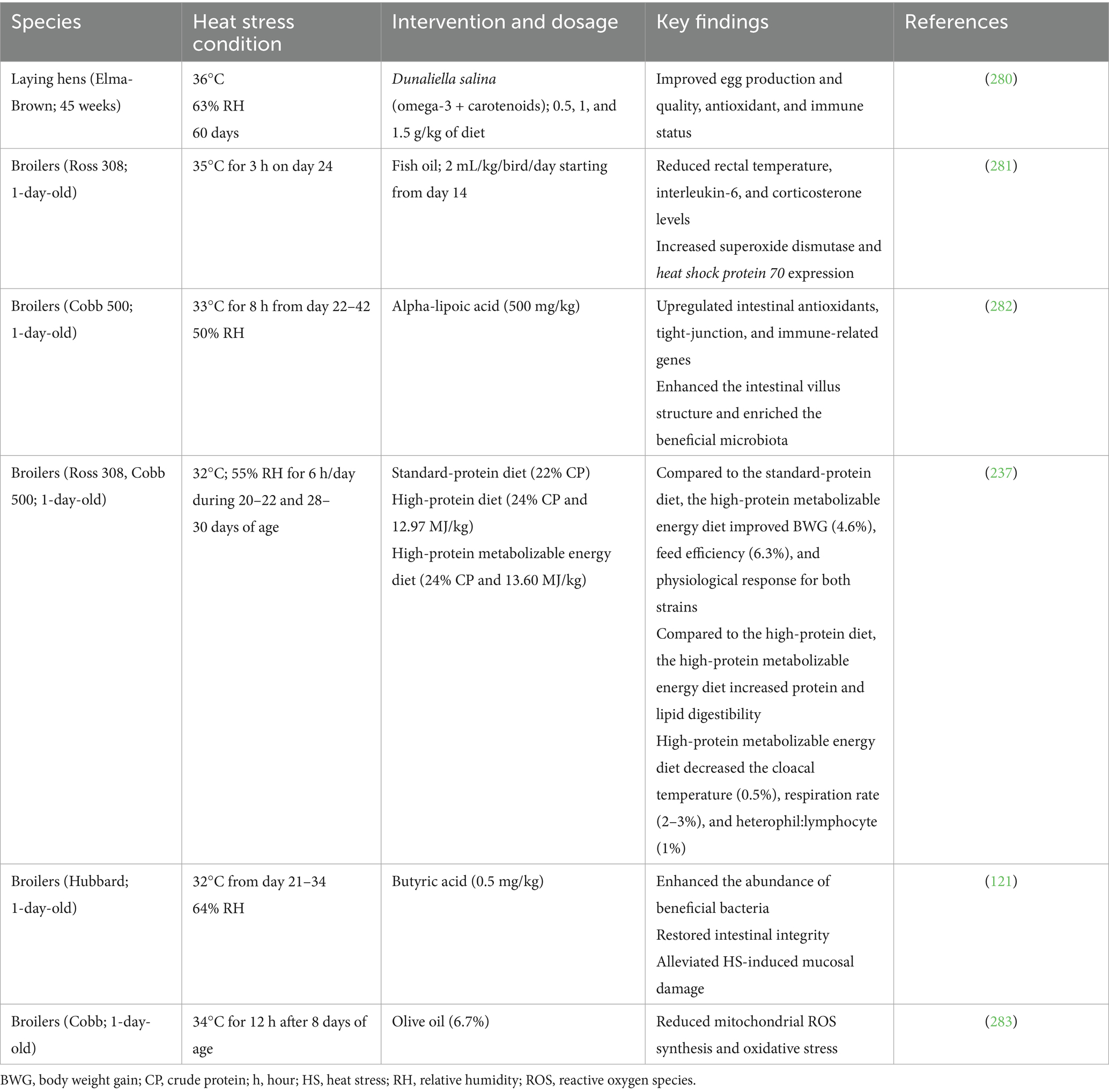 Adding 5% fat to heat-stressed laying hens’ diets increased FI by 17% (158), while broilers fed a similar diet exhibited significant improvements in performance, nutrient digestibility, and carcass traits (237). Similarly, Attia et al. (238) stated that adding oil to high-protein diets helped alleviate the harmful effects of chronic HS on broiler performance, meat lipid composition, and physiological and immunological traits. Ghahremani et al. (239) showed that partially replacing dietary energy with soybean oil and increasing dietary energy concentration enhanced intestinal function and overall productivity in heat-stressed broilers. However, one notable outcome of fat supplementation is increased abdominal fat deposition in heat-stressed broilers (428).