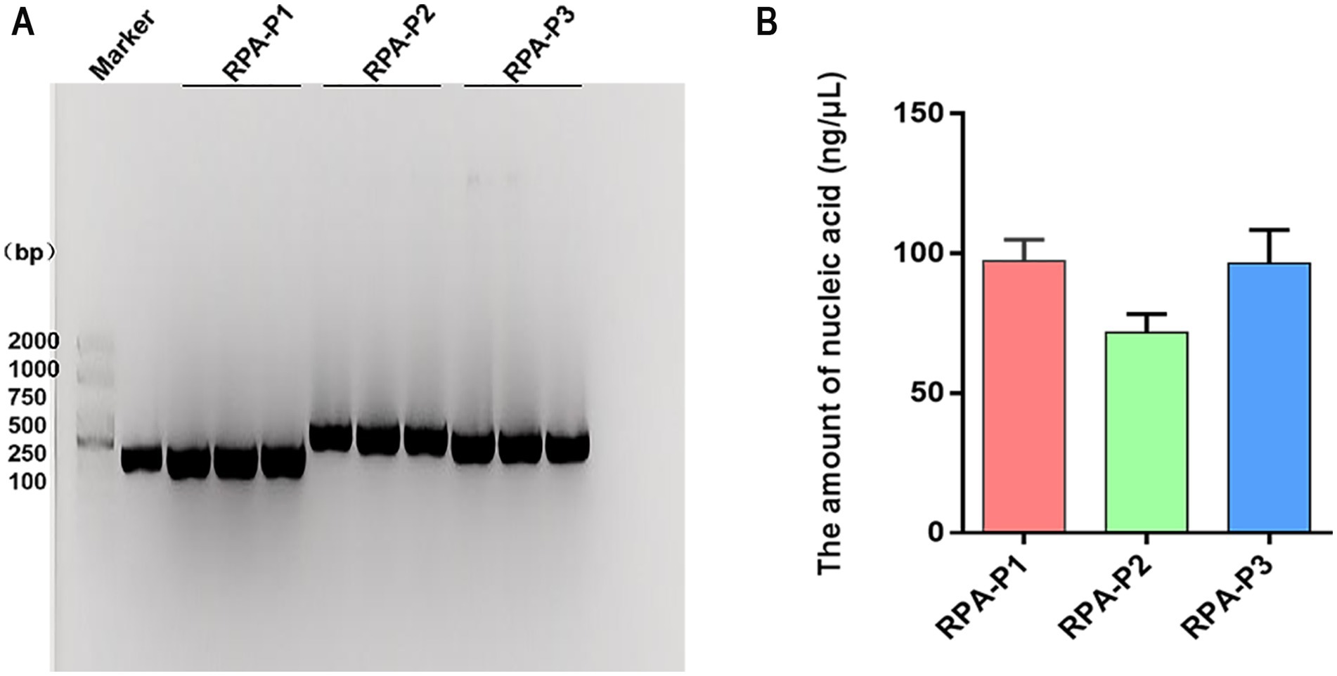 Figure 2. The amount of RPA amplification products were analyzed by Nucleic acid electrophoresis. (A) The amount of products amplified of RPA primers (RPA-P1, RPA-P2, RPA-P3) were analyzed by Nucleic acid electrophoresis. Maker: 2000 bp DNA Ladder Marker. Control: the positive sample control. (B) The amplification product yield were measured by RPA primers.