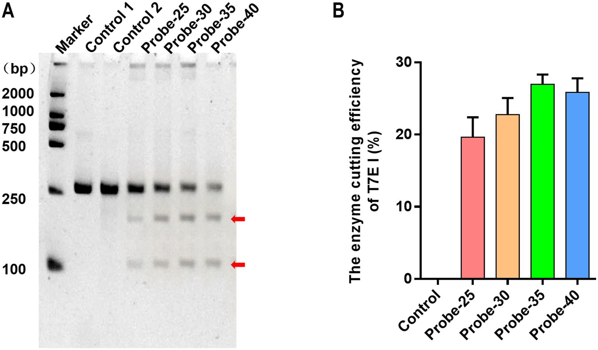 Figure 3. Different lengths of probes were hybridized with the VP2 gene for T7E I recognition and enzyme digestion. (A) The enzyme digestion levels of T7E I were determined by PAGE gel electrophoresis. Maker: 2000 bp DNA Ladder Marker. Control 1: the negative sample control (no probe and T7E I were added). Control 2: the negative sample control (no probe was added). The red arrows indicated bands cleaved by the enzyme. (B) The binding efficiency of the probes to the VP2 gene was calculated. Control: the negative sample control (no probe was added). Cleavage efficiency (%) = [Grayscale value of cut band/(Grayscale value of cut band+Grayscale value of uncut band)] × 100%, data represent means ± SD from three technical replicates.
