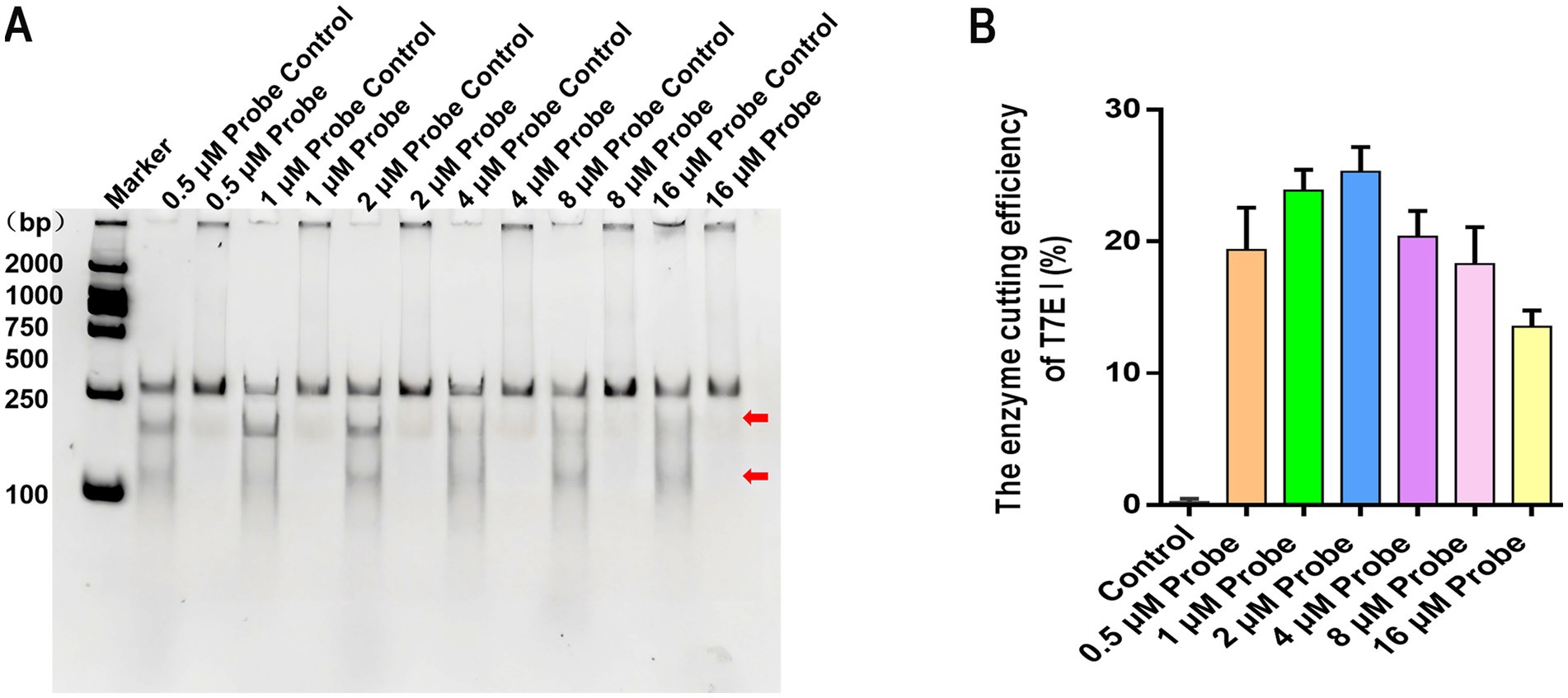 Figure 4. The effect of different probe concentrations on the formation of hybridization products and enzyme digestion efficiency. (A) The hybrid products were digested by different concentrations of probes (0.5 μM, 1 μM, 2 μM, 4 μM, 8 μM, and 16 μM). Maker: 2000 bp DNA Ladder Marker. Control: the negative sample control (no different concentrations of probes were added). (B) The effects of different concentrations of probes on the enzymatic digestion efficiency of T7E I were calculated. Control: the negative sample control (no probe was added). Cleavage efficiency (%) = [Grayscale value of cut band/(Grayscale value of cut band+Grayscale value of uncut band)] × 100%, data represent means ± SD from three technical replicates.