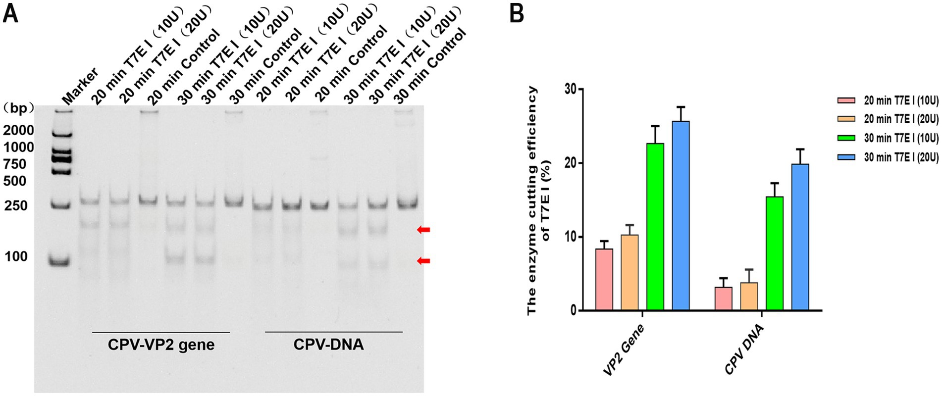Figure 5. Effect of T7E 1 concentration and time on enzyme digesting efficiency. (A) The hybrid products of CPV VP2 or DNA were digested by different concentrations of T7E I (10 U and 20 U) for 20, 30 min. Maker: 2000 bp DNA Ladder Marker. Control: the negative sample control (no T7E I was added). The red arrows indicated bands cleaved by the enzyme. (B) The effects of different concentrations of T7E I concentration and time on the enzymatic digestion efficiency were calculated. Cleavage efficiency (%) = [Grayscale value of cut band/(Grayscale value of cut band+Grayscale value of uncut band)] × 100%, data represent means ± SD from three technical replicates.