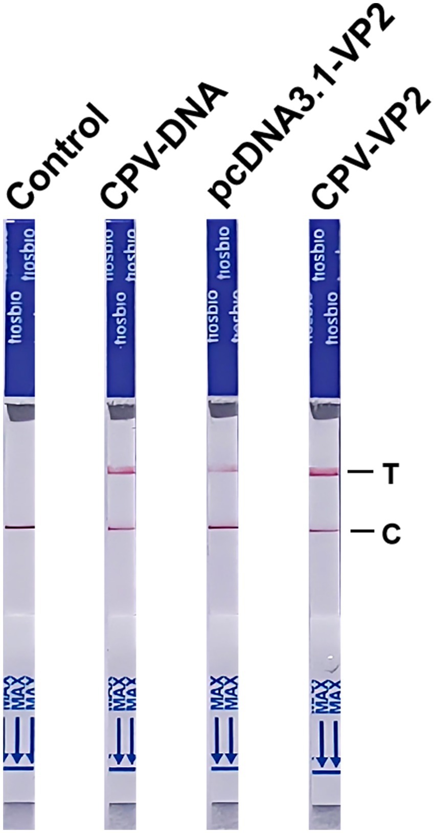 Figure 6. The NMED results for different samples. Control: the sample was nuclease-free water; CPV-DNA: the sample was the DNA of CPV; pcDNA3.1-VP2: the sample was the plasmid pcDNA3.1-VP2; CPV-VP2: the sample was the VP2 gene of CPV. C line: the control line; T line: the test line.
