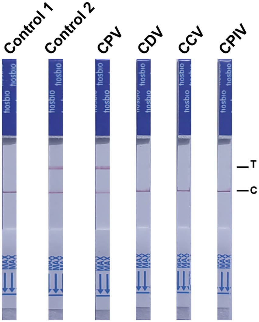 Figure 7. The NMED results of different types of virus samples. Control 1: the sample was nuclease-free water; Control 2: the sample was the DNA of CPV; CPV: the sample was the virus of CPV; CDV: the sample was the virus of CDV; CCV: the sample was the virus of CCV; CPIV: the sample was the virus of CPIV. C line: the control line; T line: the test line.