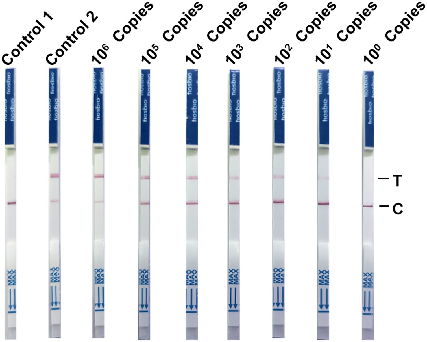 Figure 8. The NMED results of virus gradient copy number samples. Control 1: the sample was nuclease-free water; Control 2: the sample was the DNA of CPV; 106 Copies: the sample was 106 viruses; 105 copies: the sample was 105 viruses; 104 copies: the sample was 104 viruses; 103 copies: the sample was 103 viruses; 102 copies: the sample was 102 viruses; 101 copies: the sample was 101 viruses; 100 copies: the sample was 100 viruses. C line: the control line; T line: the test line.