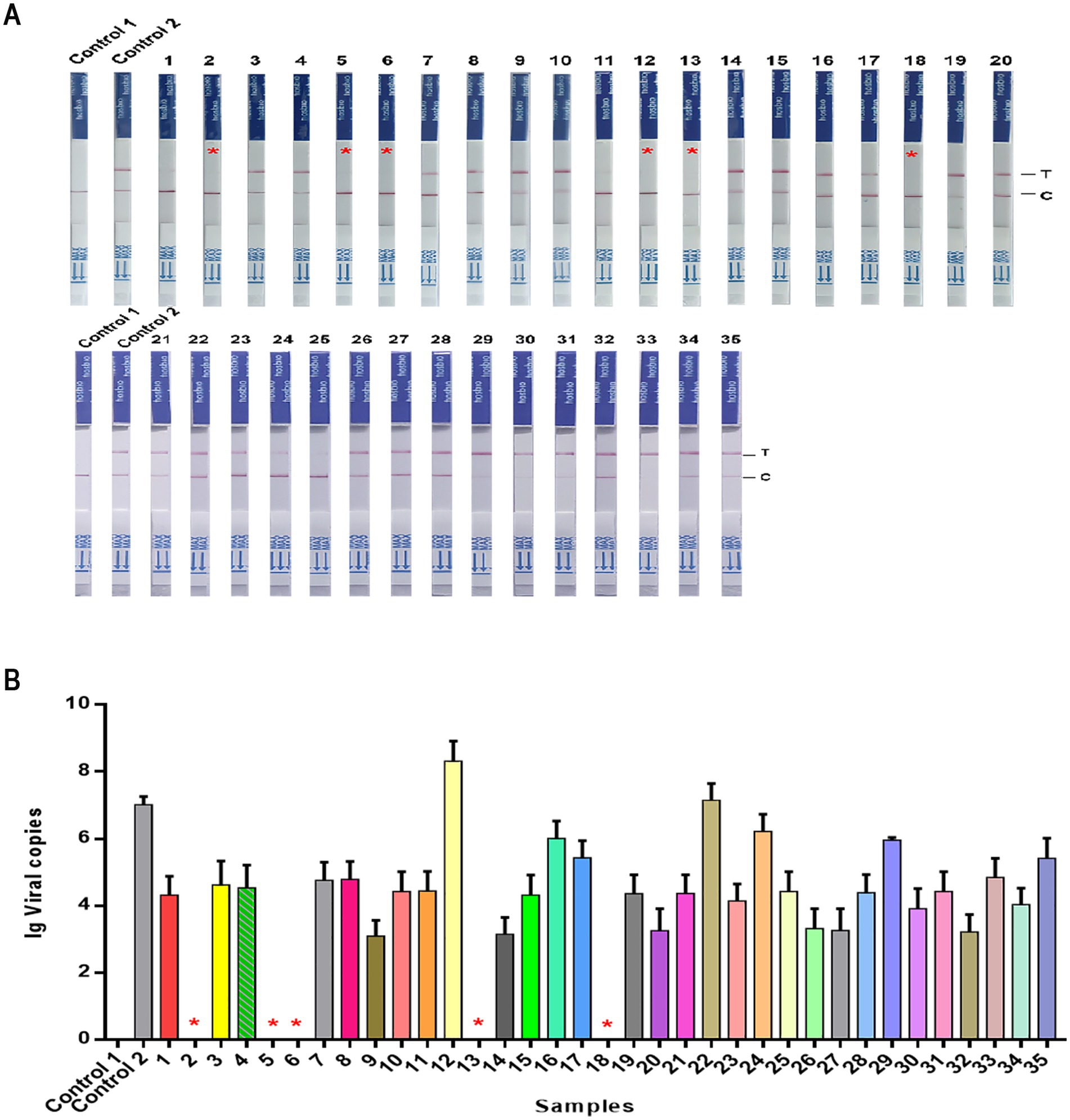 Figure 9. The detection results of CPV clinical samples. (A,B) Control 1: the sample was nuclease-free water; Control 2: the sample was the DNA of CPV; 1 ~ 35: different CPV clinical samples. *The negative sample.