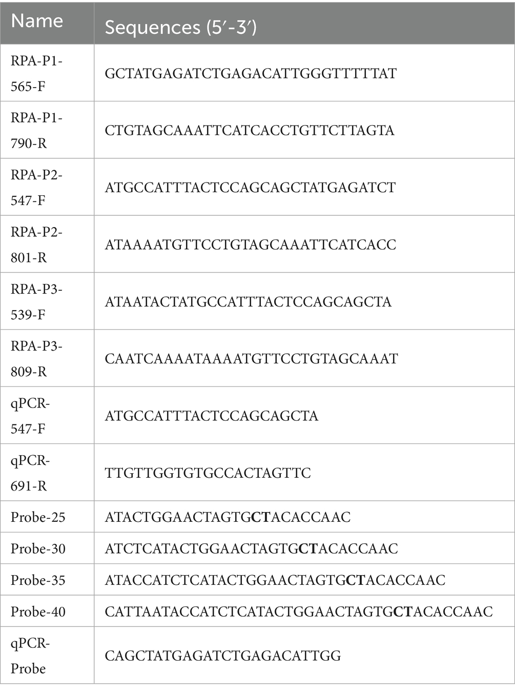 E.Z.N.A.™ EndoFree Plasmid Midi Kit, PAGE Gel Preparation Kit were purchased from Shanghai Solarbio Biotechnology Co., Ltd.; TwistAmpTM Basic Kit was purchased from TwistDx Bioscience Co., Ltd.; StarSpin Fast Virus DNA/RNA Kit was purchased from Beijing Genstar Biotechnology Co., Ltd.; 1 × Phosphate Buffered Saline, Tryptone, Yeast, Sodium chloride, Ampicillin sodium, Agarose, General DNA Purification, SerBlue nucleic acid dye and Recovery Kit were purchased from Wuhan Servicebio Co., Ltd.; HiScript III 1st Strand cDNA Synthesis Kit, DNA Marker (DL500, DL2000), 6 × DNA Loading Buffer, AceQ Universal U + Probe Master Mix V2, RoomTemp Sample Lysis Kit were purchased from Nanjing Vazyme Biotechnology Co., Ltd. T7E I was purchased from Beijing viewsolid biotechnology Co., Ltd.; DNA Gel Extraction Kit was purchased from Beijing Tsingke Biotech Co., Ltd.