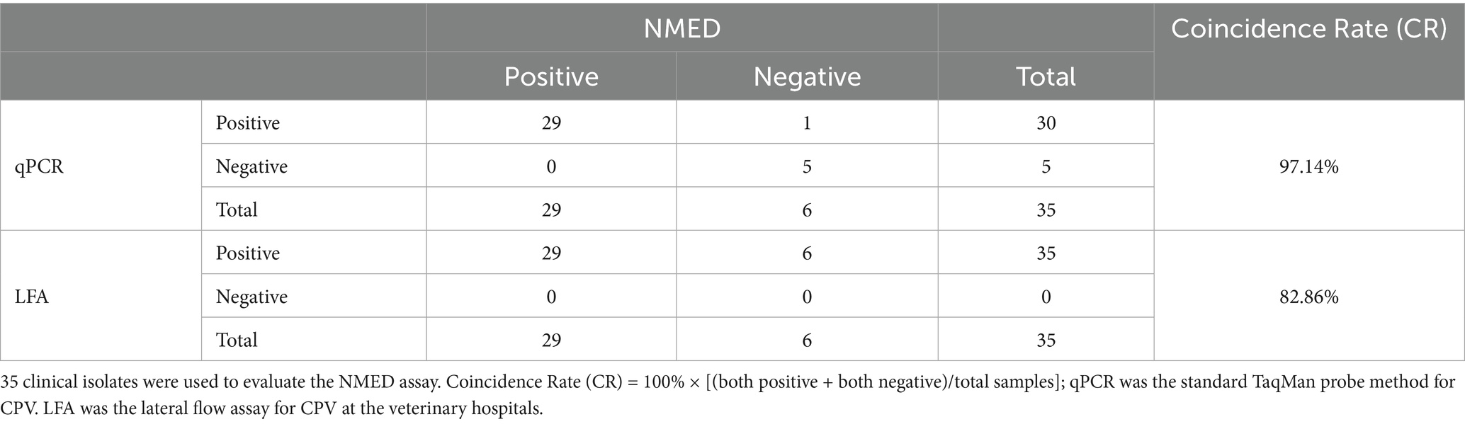 We also evaluated the performance of NMED in diagnosing CPV using clinical isolates. 35 suspected CPV-positive fecal samples, initially screened as positive by LFA and collected from veterinary hospitals, were subjected to analysis. Using qPCR as the gold standard, the clinical detection capability of NMED was compared. NMED detection identified 6 negative results and 29 positive results (Figure 9A), corresponding to a positivity rate of 82.86% (Table 2). In contrast, qPCR analysis revealed that 5 of the 35 viral samples yielded negative results, while 30 were positive (Figure 9B). Compared with the qPCR gold standard, the NMED demonstrated a concordance rate of 97.14% (Table 2). These results demonstrate that the NMED method is reliable and exhibits significant potential for application in clinical diagnostics.