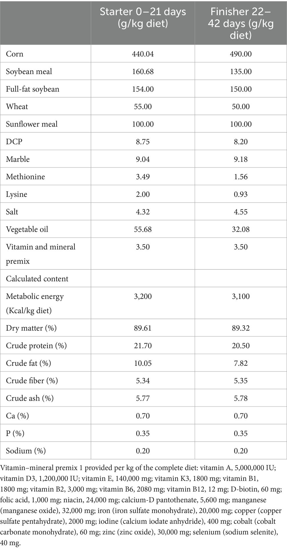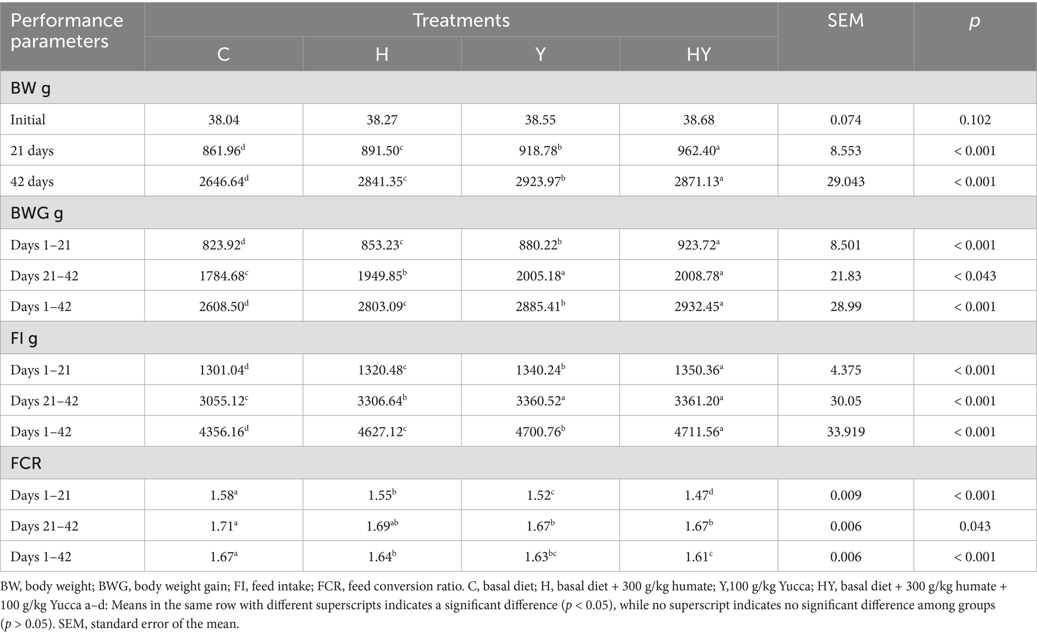 In this study, a total of 240 one-day-old Ross 308 broiler chicks with an initial live weight of 38.38 ± 0.44 g were randomly divided into 4 groups. Each group consisted of five replicate groups, each containing 12 chicks. The study groups were as follows: Control (C) basal diet, 300 mg/kg humate + basal diet (H), 100 mg/kg Yucca + basal diet, 300 mg/kg humate + 100 mg/kg Yucca + basal diet (HY). Chickens were provided with feed and water ad libitum until 42 days of age. The feed was prepared to be isocaloric and isonitrogenous. The initial and final diets (Table 1) were administered on days 1 and 21, and days 22 and 42, respectively. The compound feeds were prepared by mixing the powdered raw materials and feed additives using a mixer located in the mixing facility. The ambient temperature was initially set to 32 ± 1 °C and gradually reduced to 24 ± 1 °C. The lighting program consisted of 23 h of light and 1 h of darkness (for 42 days), and the relative humidity was maintained at 65%. Each 1.4 m × 1.2 m floor cage was equipped with wood shavings as bedding material, a round feeder, and four to five nipple drinkers to ensure adequate access to feed and water. The vaccination schedule of the company from which the chicks were sourced was followed. Newcastle vaccination was administered nine days after hatching, and Gumboro vaccination was applied on the 11th day. In the study, the usage doses of humate and Yucca were determined by taking averages based on the literature review. In addition, the amounts of the additives were recommended by the companies from which they were sourced. Each kg of humate contained 160 mg polmeric polyhydroxy acid (humic, fulvic, ulmic and humatomelanic asids). 663.3 SiO2 and other minerals (Mn 50 mg, Zn 60 mg, Fe 60 mg, Cu 5 mg, Co 0.2 mg, I 1 mg, Se 0.5 mg, and Al Na, K, Mg and P in trace amounts). Yucca schidigera, in 100% pure powder form, was sourced from Vizyonmix BF2338 Biopowder. Saponins are generally amorphous and colorless molecules, but they have types that are crystalline and white in color; they are soluble in polar solvents such as water, ethyl alcohol, and methyl alcohol (39). Structurally, saponins consist of two parts: the glycan and the aglycone, also known as sapogenin, and depending on the structure of the aglycone part, they are grouped into two categories: steroidal or triterpenoidal saponins.