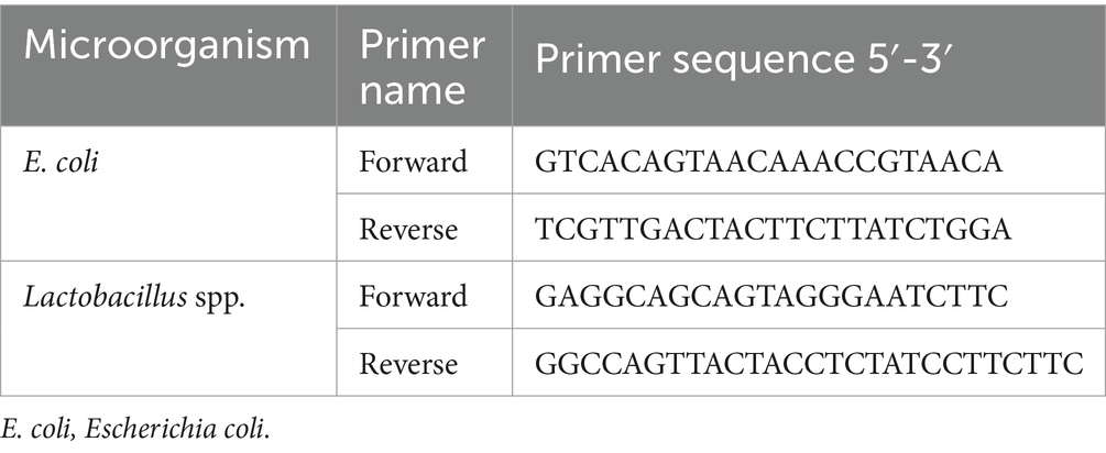 Immediately following slaughter, the contents of the cecum were rapidly removed, flash-frozen in liquid nitrogen, and stored at −80 °C to determine the levels of Lactobacillus spp. and Escherichia coli (E. coli) using real-time PCR. Furthermore, DNA isolation was performed using the Qiagen QIAamp DNA Stool Mini Kit (Hilden, North Rhine-Westphalia, Germany). The concentrations and purity levels of the DNA extracted after isolation were determined using a Nanodrop device (Thermo Scientific, Wilmington, DE, USA). Primer designs for Lactobacillus spp. and E. coli microorganisms were prepared using the NCBI and ENSEMBLE gene banks (Table 2). The specifications of the prepared primers were examined using the BLAST program. Real-time PCR was performed using LightCycler® 480 SYBR Green I Master Mix (Roche Diagnostics, Mannheim, Germany). Amplification curves were generated using LightCycler® 480 II software to detect and quantify the target microorganisms. Cycle threshold (Ct) values were recorded, and the presence of positive samples was confirmed. The accuracy of the results was validated using Tm Calling Mode, and the data were evaluated accordingly. It was conducted at a private company in Istanbul.