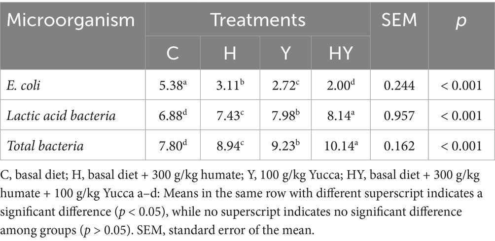 Lactic acid bacteria are known to be beneficial microorganisms for intestinal health, and in our study, a significant increase in the number of these bacteria was observed in the humate and Yucca-supplemented groups. In particular, the HY group reached the highest level of lactic acid bacteria, indicating that the combination is more effective in positively regulating the intestinal microbiota. In the literature, it has been reported that Yucca supplementation supports the colonization of lactic acid bacteria by increasing intestinal villus height (31). Additionally, Mudronova et al. (32) reported that humate promotes the proliferation of beneficial bacteria. The increase in lactic acid bacteria in our study confirms the balancing effect of these additives on the intestinal flora and demonstrates their significant role in improving intestinal health.