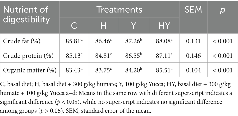 In the literature, the supportive effects of humate and Yucca supplementation on digestive processes have been reported in various studies. For example, Mudronova et al. (32) reported that humic substances enhance nutrient absorption and improve organic matter digestibility by strengthening the intestinal mucosa. Similarly, Mohammed et al. (34) demonstrated that Yucca schidigera supplementation improves intestinal environment and increases fat and protein digestibility. The increases in crude fat, crude protein, and organic matter digestibility observed in our study are consistent with these findings and support the hypothesis that humate and Yucca enhance digestive enzyme activity by supporting intestinal health. The highest digestibility values in the HY group indicate that the combined use of humate and Yucca creates a stronger effect than their individual use. This synergistic effect may result from the combination of humate’s mineral absorption-enhancing property and Yucca’s intestinal villus structure-improving effect (27, 35).