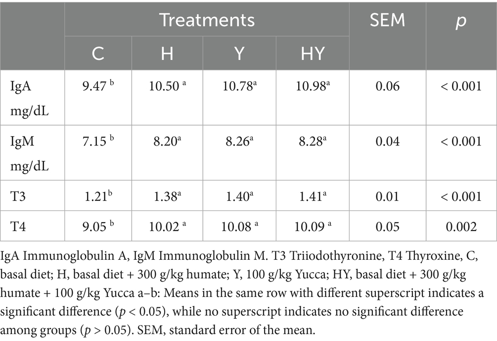 Levels of T3 (p < 0.001) and T4 (p < 0.002) were significantly increased in the humate and Yucca-supplemented groups compared to the control group. The HY group showed the highest values for T3 and T4 levels, but the differences between it and the H and Y groups were not statistically significant (p > 0.05). These findings suggest that humate and Yucca supplementation supports metabolic processes and increases thyroid hormone production. Additionally, Obianwuna et al. (27) reported that Yucca-containing mixtures increased T3 and T4 levels by 10% and that this effect was associated with the relationship between gut health and metabolic efficiency. The increases in T3 and T4 levels in our study are consistent with these findings and strengthen the hypothesis that humate and Yucca improve gut health, thereby enhancing nutrient absorption and supporting metabolic processes. The slightly elevated values in the HY group suggest the presence of a synergistic effect, but the lack of statistical significance suggests that this effect may become more pronounced with extended duration or varying dosages.