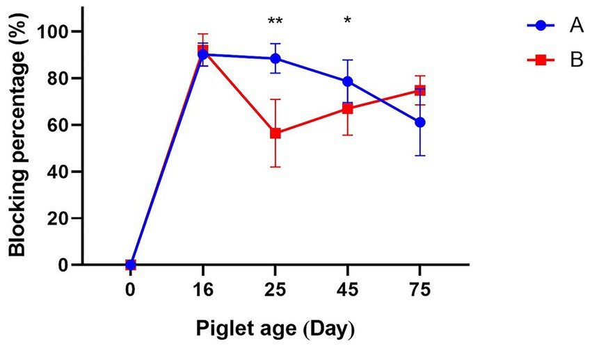The level of maternal antibodies in sows after immunization is reflected by the CSFV antibody blocking percentage of their piglets. The antibody levels of CSFV in piglets produced by Group A decreased with increasing age, but remained above 70% until 75 days of age. The CSFV antibody levels in piglets born in Group B were above 90% at 16 days of age, but then fell quickly, dropping below 70% by 25 days of age and remaining significantly lower than those in Group A. In order to ensure the provision of immune protection for the batch of piglets in question, the primary immunization was administered in the form of the C-strain vaccine on the 25th day of age. Subsequent to the primary vaccination, an increase in antibody levels was observed in Group B piglets. At 45 days of age, the antibody levels increased to 66.93 ± 11.93%, remaining at a low level that did not meet the threshold for herd immunity and was significantly lower than that of Group A (78.63 ± 9.12%). Following the administration of a booster vaccination at 55 days of age, an increase in antibody levels was observed, reaching 74.80 ± 6.3% at 75 days of age (Figure 1).