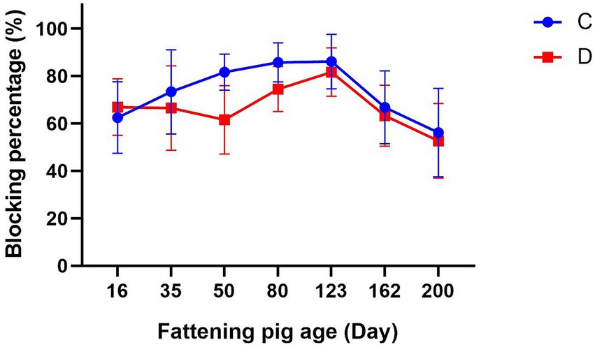 The CSFV antibody levels of fattening piglets in groups C and D were both higher than the specified standard before immunization, and no significant difference was observed between the two groups. Subsequent to immunization, the CSFV antibody levels in Group C demonstrated a sustained upward trajectory until 14 weeks post-immunization. Thereafter, the antibody levels initiated a decline, yet persisted at approximately 60% at 25 weeks post-immunization. Group D did not demonstrate a significant increase in antibody levels during the initial two weeks following immunization. By week 4, a decline in antibody levels to 61.54 ± 14.38% was observed. Subsequent to booster vaccination of the swine in Group D at 55 days of age, an increase in antibody levels was observed, albeit with a subsequent decline commencing the 14th week post-primary vaccination (Figure 2).