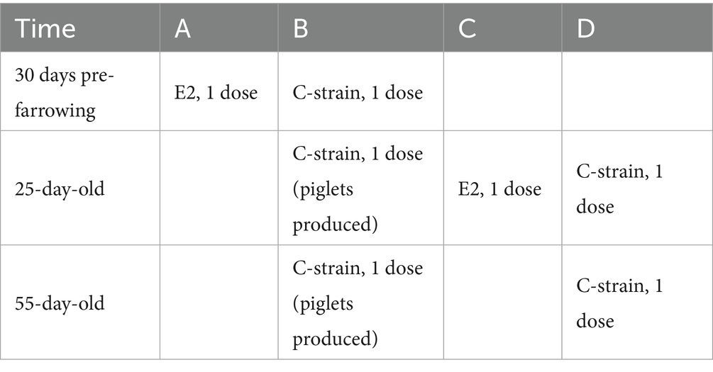 A total of 182 healthy sows in the pig farm, one month before farrowing, were randomly divided into two groups: Group A (142 sows) and Group B (40 sows). Group A was immunized with the E2 subunit vaccine, while Group B was immunized with the C-strain vaccine. The 1,807 piglets in the pig farm that were about to be weaned were randomly divided into two groups: Group C (1,000 piglets) and Group D (807 piglets). Group C was immunized with the E2 subunit vaccine, while Group D was immunized with the C-strain vaccine (20). The dosage and number of immunizations were administered in accordance with the instructions outlined in the manual, with specific details listed in Table 1. During the trial period, the pigs were fed and managed in accordance with the pig farm’s daily management procedures.