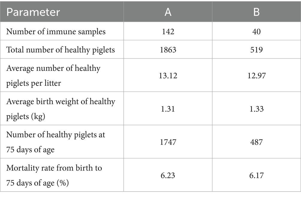 Following immunization, pigs in all groups exhibited normal feeding and mental status, with body temperatures remaining within the normal range. No instances of immune stress or other adverse effects were observed. The average number of healthy piglets per litter for sows in Groups A and B was 13.12 and 12.97, respectively, with an average birth weight of 1.31 kg and 1.33 kg per piglet, respectively. By 75 days of age, the mortality rates for piglets born to sows in the two groups were 6.23 and 6.17%, respectively, with no significant difference between the two groups. Detailed data is presented in Table 2.