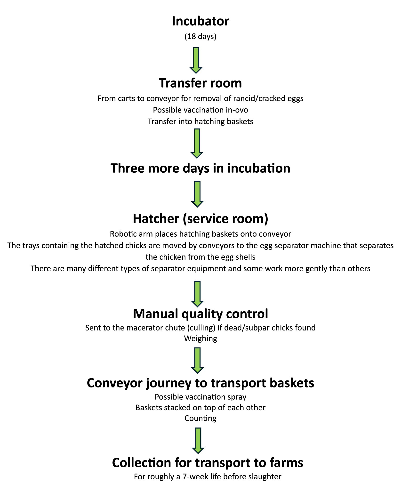 Figure 1. Representative stages in a commercial “broiler” chick hatchery, adapted from content in the USDA’s Poultry Industry Manual (4) (p. 16–18) and observations by Knowles et al. (3).