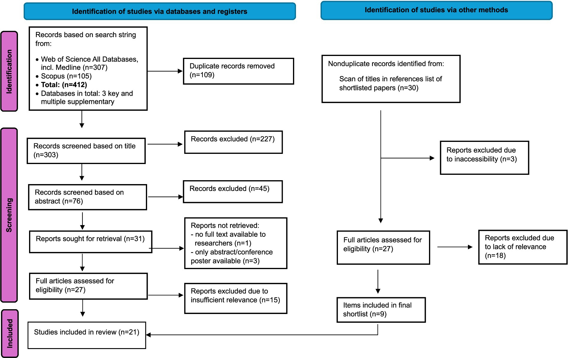 The Preferred Reporting Items for Systematic Reviews and Meta-Analyses (PRISMA) guidelines provide best practice guidelines for conducting systematic reviews (19). Accordingly, the PRISMA guidelines (2020 updated version) were adhered to in the present study. The following leading bibliographic scientific literature databases were used: Web of Science All Databases and Scopus. This concurs with current recommendations regarding the selection of databases for systematic reviews, namely, the use of at least three verified databases (20). Because the All Databases version of Web of Science comprises its Core Collection in addition to Medline and numerous supplementary databases, this fulfills and surpasses these criteria. Additionally, Web of Science Core Collection, Medline, and Scopus have recently been designated as “principal” databases that should be used for systematic reviews (21). They are also all either multidisciplinary or biomedically oriented, which is suitable for the field of enquiry at hand.