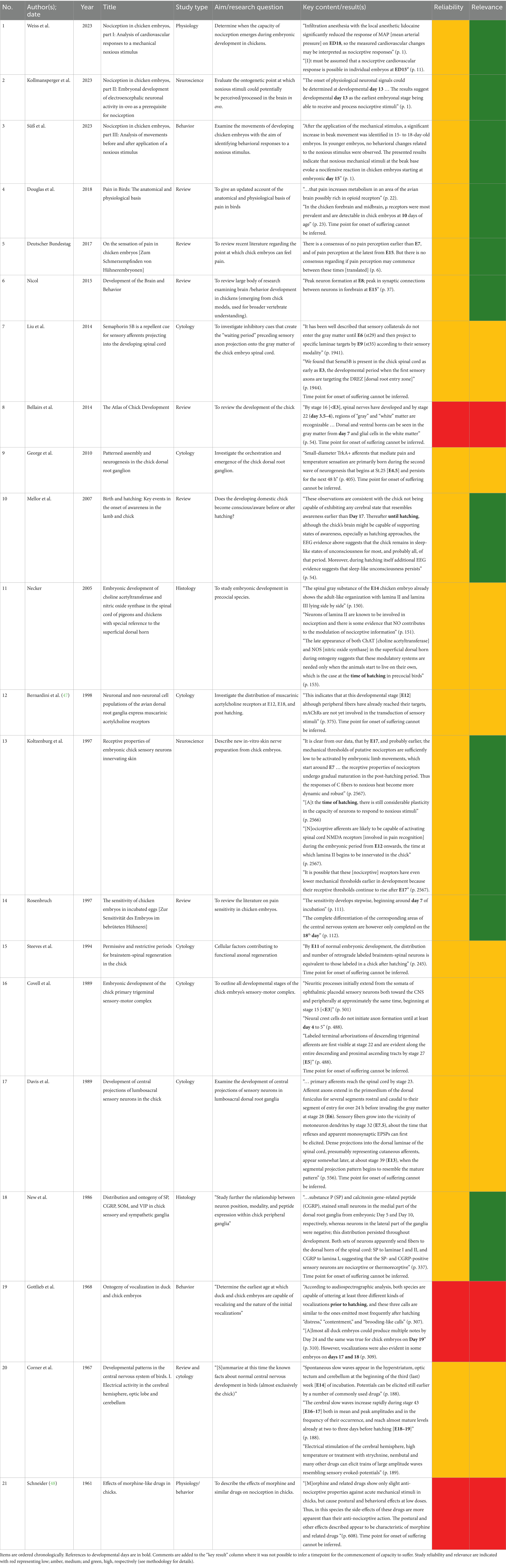 Table 1 summarizes the results of the systematic review regarding the stage of life at which chicks begin to have the ability to suffer. Twenty-one relevant studies were located, comprising 6.5 reviews and 14.5 empirical studies. Most items (n = 18) were papers published in peer-reviewed journals, apart from one academic book chapter (23), one academic book (24), and one report from the science department of the German parliament (25). Over 50% of the shortlisted items were published after the year 2000. The 14.5 empirical studies comprised physiological (n = 3.5), behavioral (n = 2.5), and cytological/histological (n = 8.5) approaches, with the “0.5” number stemming from mixed-method studies. Of the 21 shortlisted items, only 10 had titles, aims, or results that were explicitly relevant to the key research question of the present report (i.e., those marked green in the Relevance column of Table 1). Nine of these 10 focused on pain/nociception rather than another aspect of the capacity to suffer, while one (26) focused on awareness, but without defining it. Five of these 10 most-relevant items explicitly defined pain using the IASP’s definition (see subsection 1, for details); another defined “nociceptor” briefly (27), while the remaining four gave no definition of pain or other terms related to suffering or welfare. This was also the case for the 11 less relevant items. See subsection 3.5 for a discussion of the reliability of the shortlisted items.