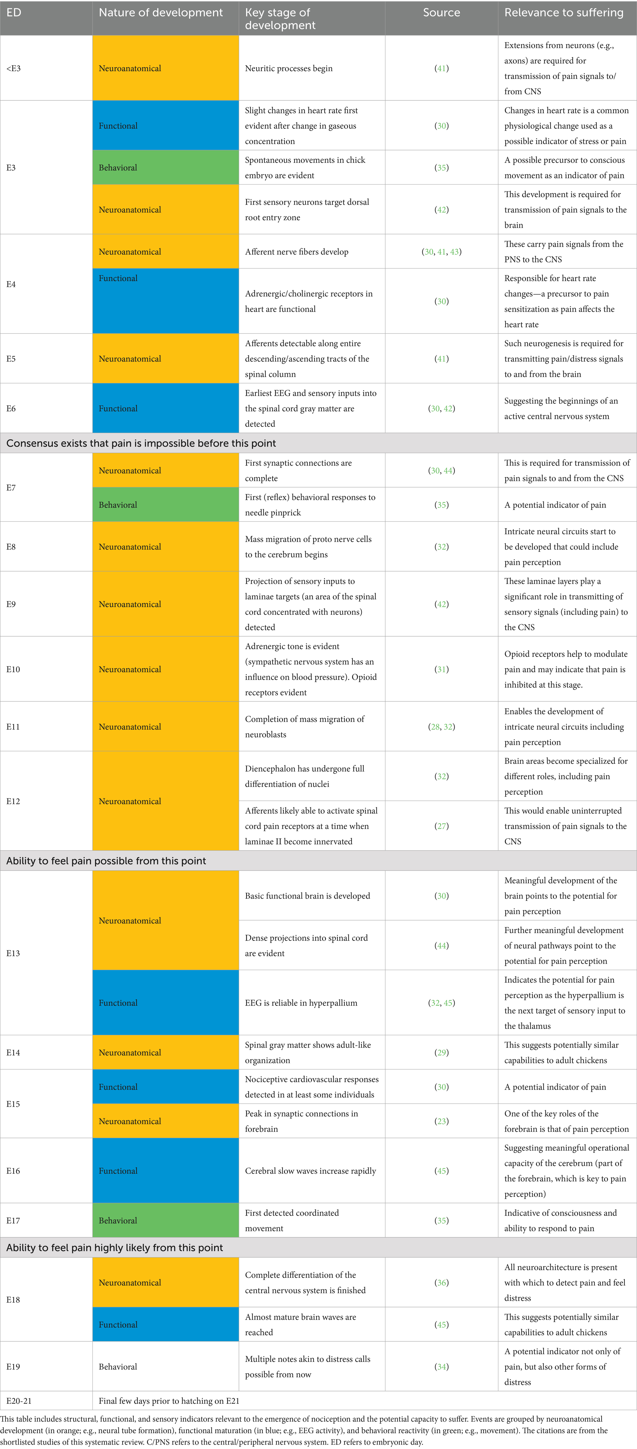 Table 1. Summary of systematic review results focusing on the question: at what stage of development do chick/chick embryos have the capacity to suffer?