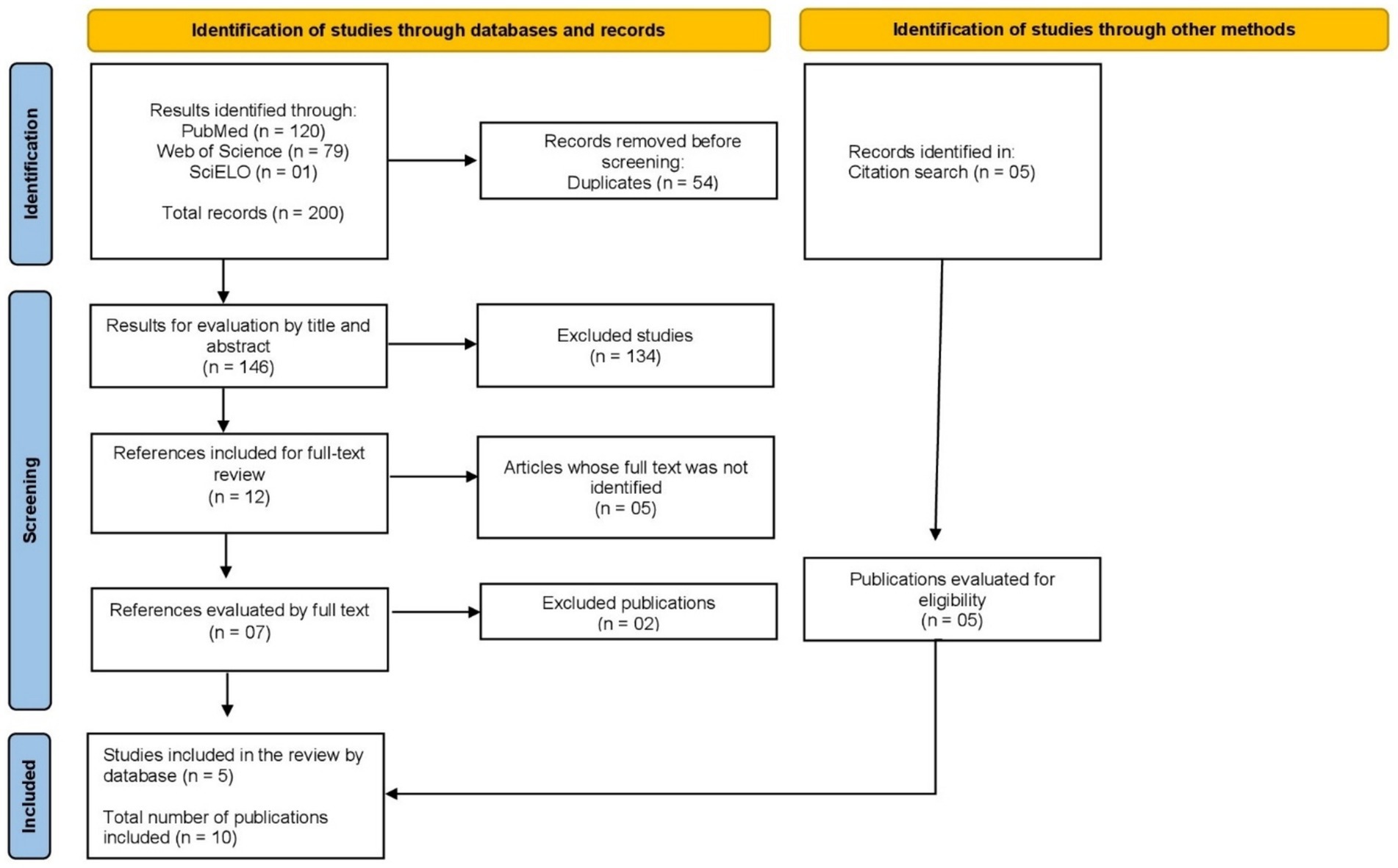 This search identified 200 studies, distributed as follows: 120 in PubMed, 79 in Web of Science, and 1 in SciELO. After removing 54 duplicates, 146 articles remained, which were screened by title and abstract. From this screening, 134 studies were excluded because they did not meet the previously established inclusion criteria. Thus, 12 articles were selected for full reading, but 5 of these did not have the full text located, leaving 7 studies for detailed analysis. Of these, 2 were excluded because they did not present data relevant to the objective of the review, resulting in the initial inclusion of 5 articles.