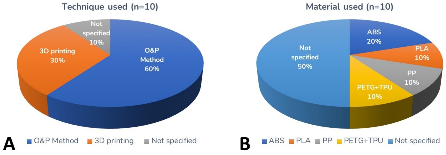 In the studies analyzed, amputations occurred primarily due to trauma, congenital deformities, and neoplasms, although the exact frequency of these causes varies between studies. The affected limbs were both thoracic and pelvic, with some studies citing thoracic limb amputations more frequently. The results regarding the type of technique and material used to manufacture the prostheses were described in Figure 2. Only 1 study of 10 did not report the materials used. The remaining 9 articles indicated the use of thermoplastics, of which 5 identified the specific polymers: Acrylonitrile Butadiene Styrene (ABS), Polylactic Acid (PLA), Polypropylene (PP), Polyethylene Terephthalate Glycol Modified (PETG) and Thermoplastic Polyurethane (TPU). Four studies mentioned the use of thermoplastics but did not specify the type (Figure 2). Only 3 of 10 studies (30%) reported the use of 3D printing in the production of prostheses (2, 10, 14), while the majority described devices manufactured through traditional O&P techniques such as vacuum forming and manual fabrication (Figure 2; Table 1). However, there is no consensus on the predominance of any material, and the exact details of the prosthesis’s composition were not fully described in all cases.
