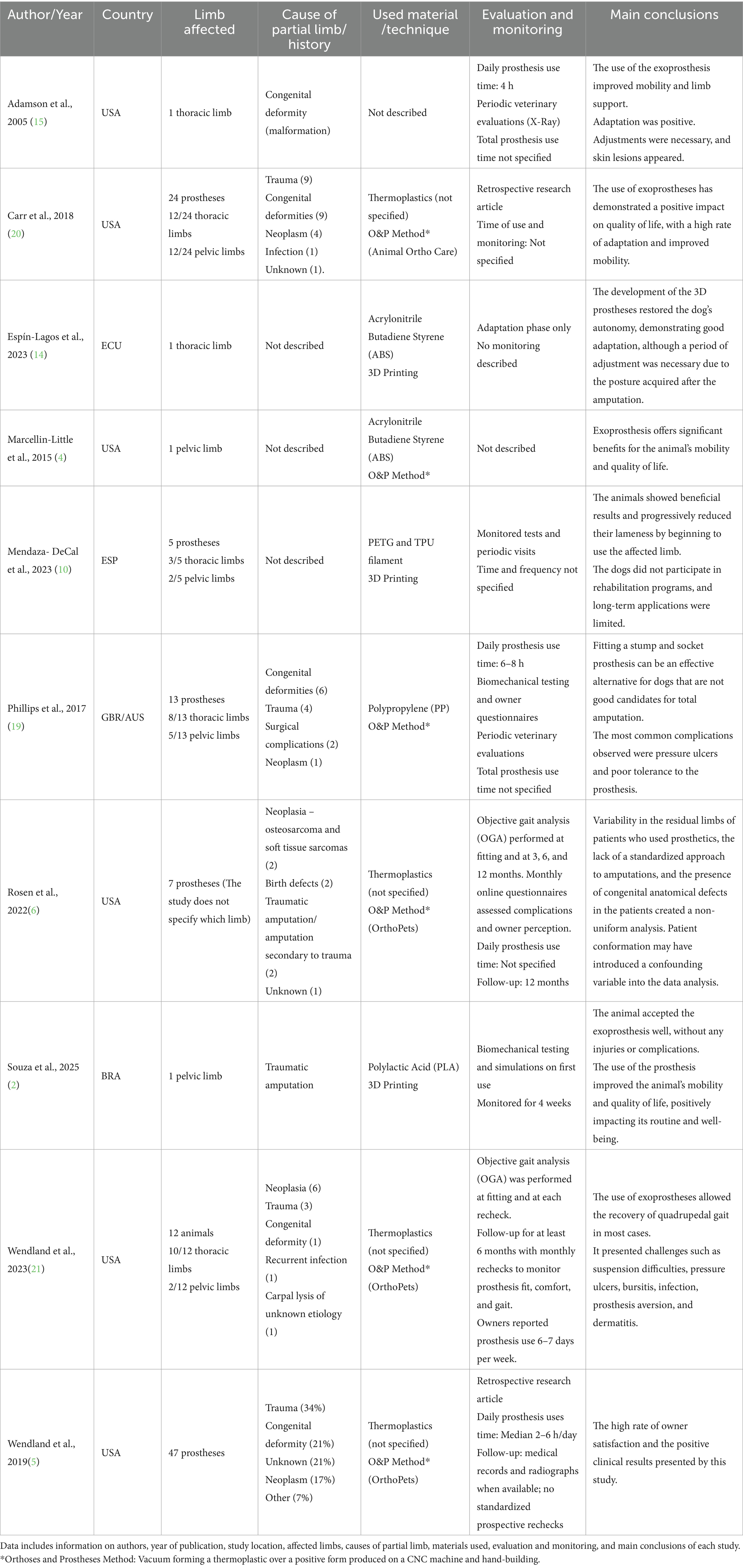 Furthermore, although the number of kinematic studies in veterinary medicine is increasing, there are still no established protocols on how to collect kinematic data in canines (22), which contributes to the variability in outcome reporting. This general absence of quantitative evaluation criteria or standardized follow-up intervals hampers the comparability of results and the ability to draw evidence-based conclusions regarding prosthetic efficacy and long-term adaptation. Future studies should adopt more consistent reporting standards, including detailed descriptions of outcome measures, prosthesis use time, and follow-up protocols, to improve methodological transparency and support the advancement of evidence-based veterinary prosthetics.