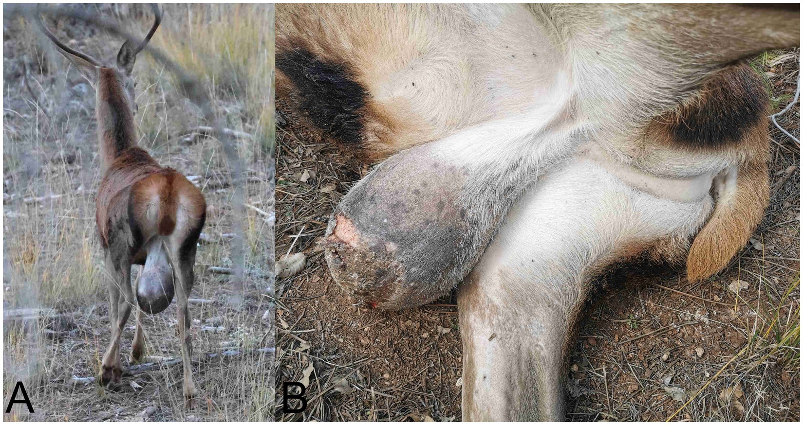 Figure 1. Scrotal enlargement in a red deer (Cervus elaphus). (A) Image of the specimen observed at a long distance in its natural habitat, showing a pronounced scrotal enlargement. (B) After culling, it was confirmed that this enlargement corresponded to a markedly enlarged testicular region, with areas of skin ulceration visible, possibly caused by the friction of the scrotal sac against surfaces.