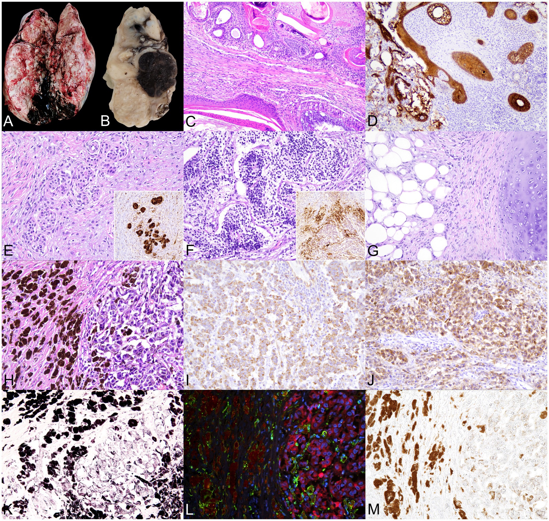 Figure 2. Right testis. Teratoma and hypomelanotic melanoma with extensive melanophage infiltration. (A) Gross images of the testicular parenchyma show complete loss of normal structure due to the presence of an irregular, poorly demarcated, multilobulated overgrowth. On sectioning, the tissue was firm, with a heterogeneous appearance, including alternating solid, necrotic, and cystic areas containing dark fluid. (B) Section of the fixed specimen shows, among other features (top to bottom), areas resembling cartilage and adipose tissue, multifocal cystic areas filled with amorphous material (keratin-like), and a well-defined nodular region of intense black color. (C–G) The teratoma displays (C) Multiple structures lined by ectodermal-derived epithelia (simple cuboidal epithelium and stratified squamous keratinized epithelium, upper and lower left) and endodermal-derived epithelia (ciliated columnar epithelium with goblet cells, lower right), 100×. (D) Immunohistochemistry (IHC) for pancytokeratin (PCK) highlights the diversity of epithelial components within the mass, 100×. (E) Possible Schwann cell cords show strong S100 immunoreactivity, confirming neural crest origin (inset: IHC for S100 of a similar area). (F) Immature neuroectodermal rosette-like formations are composed of small, densely packed, undifferentiated cells, surrounded by glial cells strongly positive for S100 and neuropil-like material (inset: IHC for S100 of a similar area). (G) Adipose and cartilaginous tissues of mesodermal origin are also present. (H–K) The invasive, poorly differentiated melanoma shows (H) Highly pleomorphic neoplastic cells with little melanin pigment on the right and numerous melanin-laden cells on the left. (I) IHC for vimentin demonstrates mesenchymal characteristics of these cells, (J) While IHC for Melan A confirms melanocytic differentiation. (K) Fontana–Masson staining confirms that the pigment in both cell types is melanin. (L) Immunofluorescence for ionized calcium-binding adapter molecule 1 (IBA1, green) and Melan A (red), with nuclei stained with DAPI (blue), reveals that melanin-laden cells are macrophages—melanophages (IBA1+)—whereas Melan A+ melanocytes contain little or no melanin; melanin autofluorescence appears brownish-orange. (M) Brightfield micrograph of the same slide and area shown in (L), no additional staining was applied, reveals melanin presence. All slides were stained with H&E, and images were captured at 200 × magnification, unless otherwise noted.