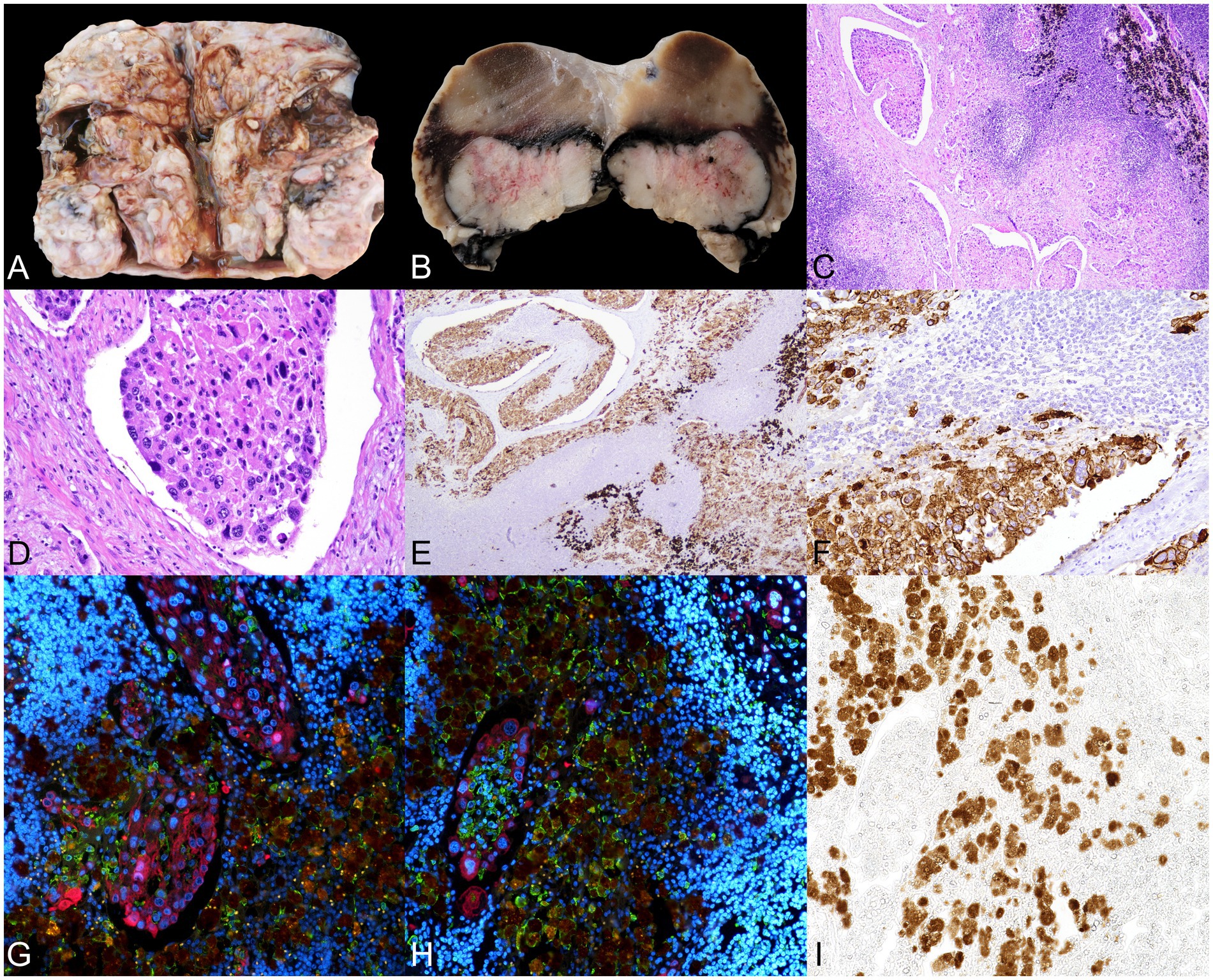Figure 3. Mass observed in the intrapelvic region, compatible with a metastatic iliac lymph node. (A) Macroscopic image of the lymph node shows complete loss of normal tissue architecture, with an irregular nodular surface and cystic cavities filled with dark fluid. (B) Section of the fixed specimen shows more preserved lymphoid tissue adjacent to an irregular, firm nodular overgrowth, partially cleared and surrounded by a pigmented zone. (C) Microscopic images of the lesion reveal lymphoid tissue displaced by a pronounced desmoplastic reaction, along with multiple dilated lymphatic vessels filled with emboli of neoplastic cells exhibiting marked cellular atypia. Melanophages are also observed (upper left corner). H&E, 40×. (D) The neoplastic cells show anisokaryosis, with generally large, round nuclei and a moderate amount of cytoplasm. H&E. (E) Immunohistochemistry (IHC) for pancytokeratin (PCK) confirms the epithelial origin of the cells present within the vascular lumina, 100×. (F) Inset of E. Neoplastic emboli are frequently accompanied by mononuclear cells. (G,H) Immunofluorescence (IF) for ionized calcium-binding adapter molecule 1 (IBA1, green) and PCK (red), with nuclei stained with DAPI (blue). Melanin autofluorescence appears brownish-orange. (G) Several neoplastic emboli in a small area. (H) Monocytes and macrophages (IBA1+) constitute a significant component of the associated mononuclear inflammatory infiltrate. Melanin-laden cells correspond to melanophages. (I) Brightfield micrograph of the same slide and area shown in (H); no additional staining was applied, which reveals melanin presence. All figures were captured at 200 × magnification, unless otherwise noted.