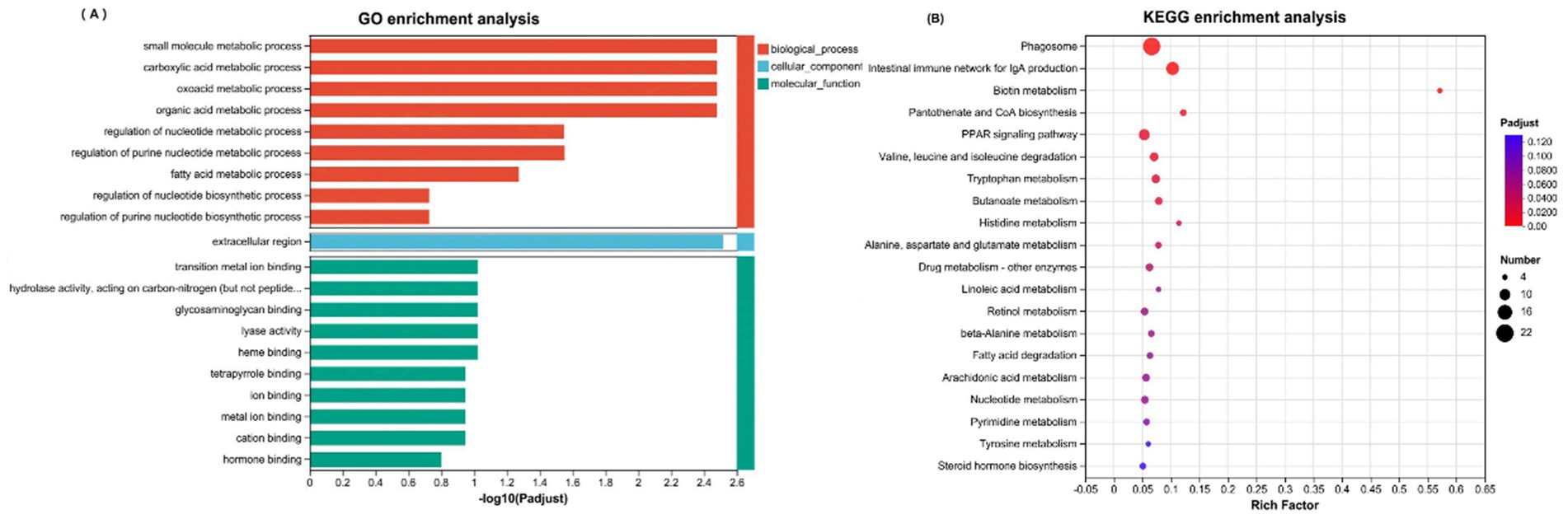 Enrichment of downregulated genes (Figures 7A,B) GO enrichment revealed their involvement primarily in the metabolism of small molecules and organic acids in biological processes, with cellular component associations related to extracellular region activities and molecular functions linked to the binding of transition metal ions. KEGG analysis revealed crucial roles in diverse metabolic pathways, such as the phagosomal pathway, biotin metabolism, coenzyme A biosynthesis, and the PPAR signaling pathway.