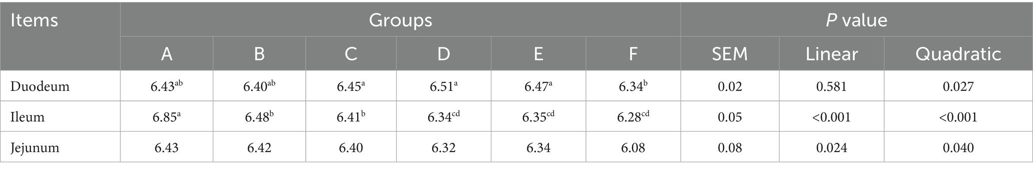Table 7 shows the impact of PAR on the gastrointestinal pH of pre-bred laying hens. In the duodenal segment, while no significant differences in luminal pH were observed among the individual treatment groups (A-F) (p > 0.05), a significant quadratic increase in luminal pH was noted in correlation with increasing PAR substitution levels (p < 0.05). Conversely, in the ileal compartment, the luminal pH of Group A was significantly greater than that of the other experimental groups (p < 0.05). Similarly, in the jejunal region, the luminal pH in Groups A through C was significantly greater than that in Group F (p < 0.05). For both the ileal and jejunal segments, the luminal pH significantly decreased in a linear and quadratic manner as the substitution rate of PAR increased (p < 0.05).
