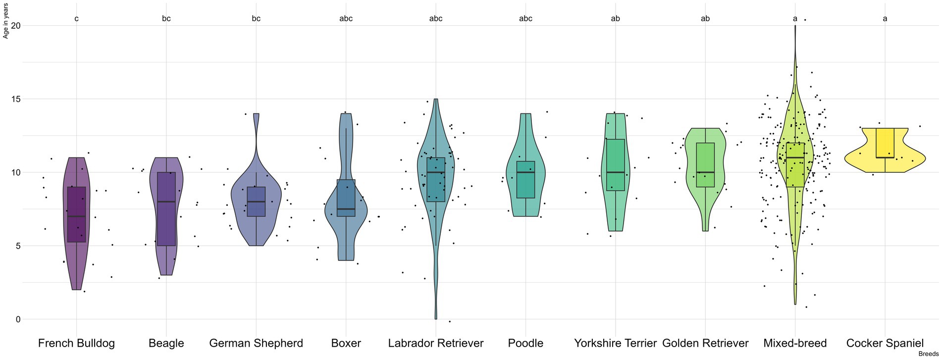 Figure 1. Violin plot representing the age of canine digestive tract tumors among the major breeds included in the study (with n > 10). The letters represent differences in the mean ages, according with ANOVA and the Tukey tests.