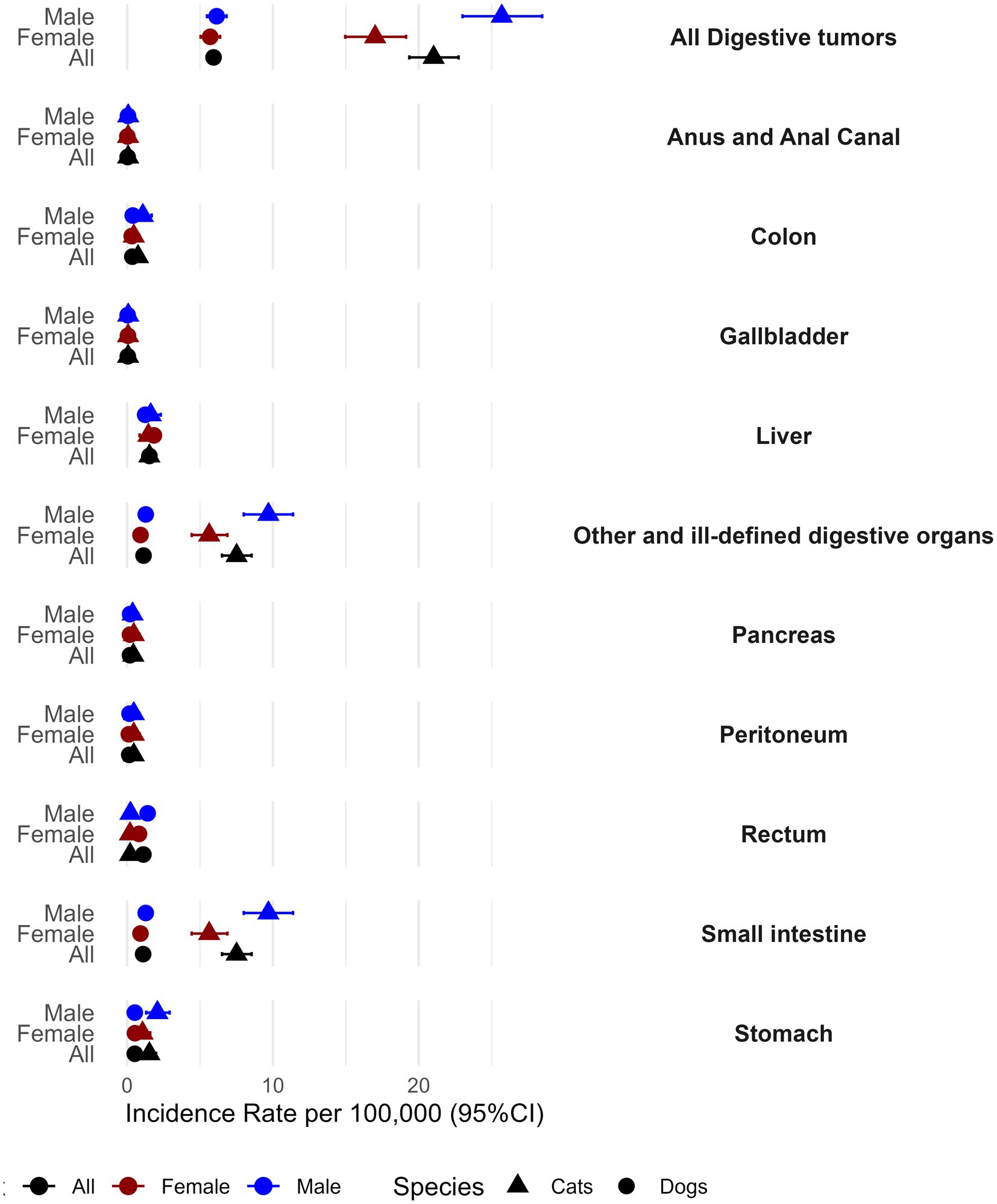 In both species, males (cats 9.7 CI95% 8.00–11.38; dogs 1.3 CI95% 0.98–1.60) exhibited a higher IR for small intestine tumors, compared to females (cats 5.6 CI95% 4.43–6.88, dogs 0.9 CI95% 0.66–1.20) (Figure 2 and Supplementary Table S4). Similar findings were also observed for “other and ill-defined” digestive organ tumors.