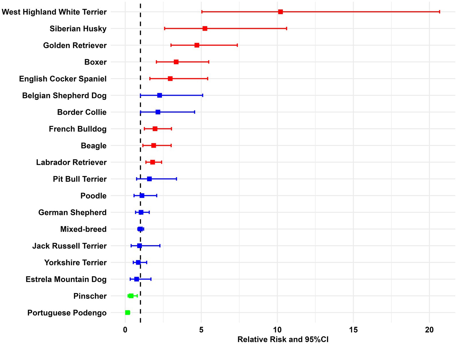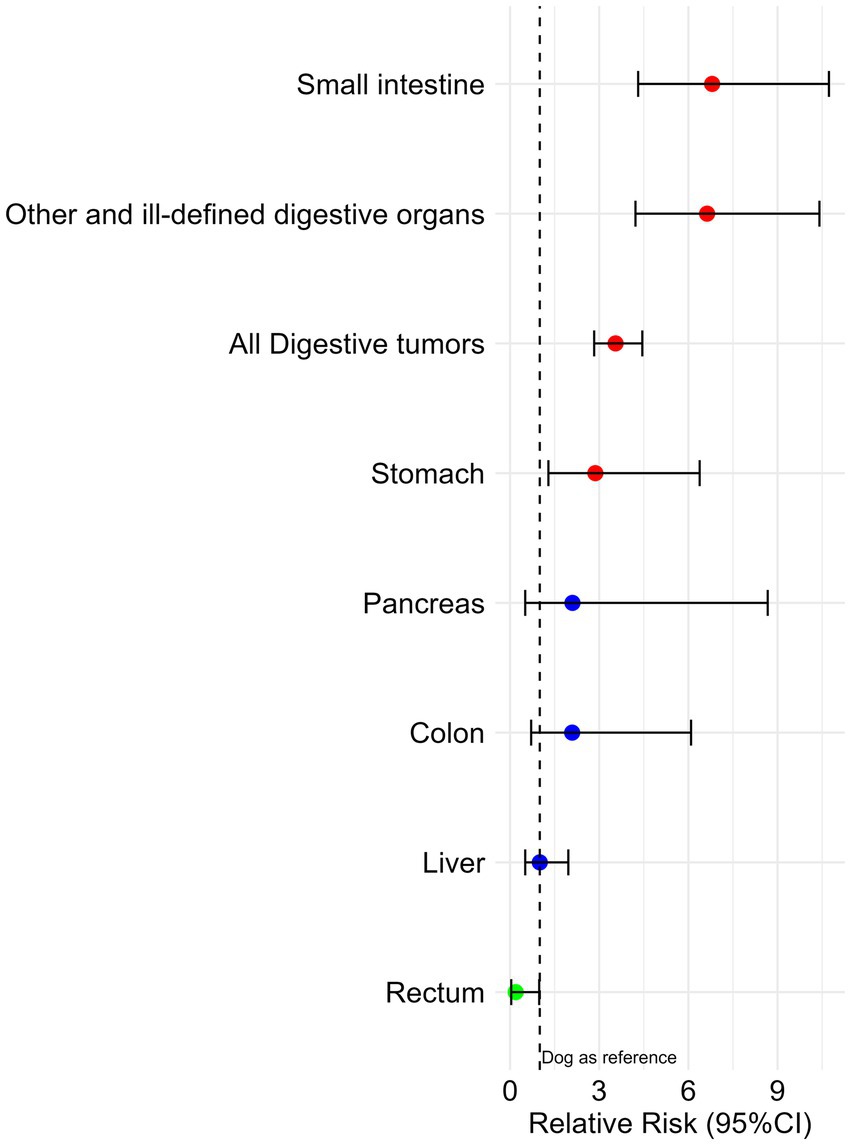 Figure 6. Canine breed-specific relative risk for digestive tract tumors (95% Confidence Intervals). Color red indicates breeds presenting significantly increased risk; blue denotes no significant differences compared to the reference group; and green, indicates breeds with significantly decreased risk.