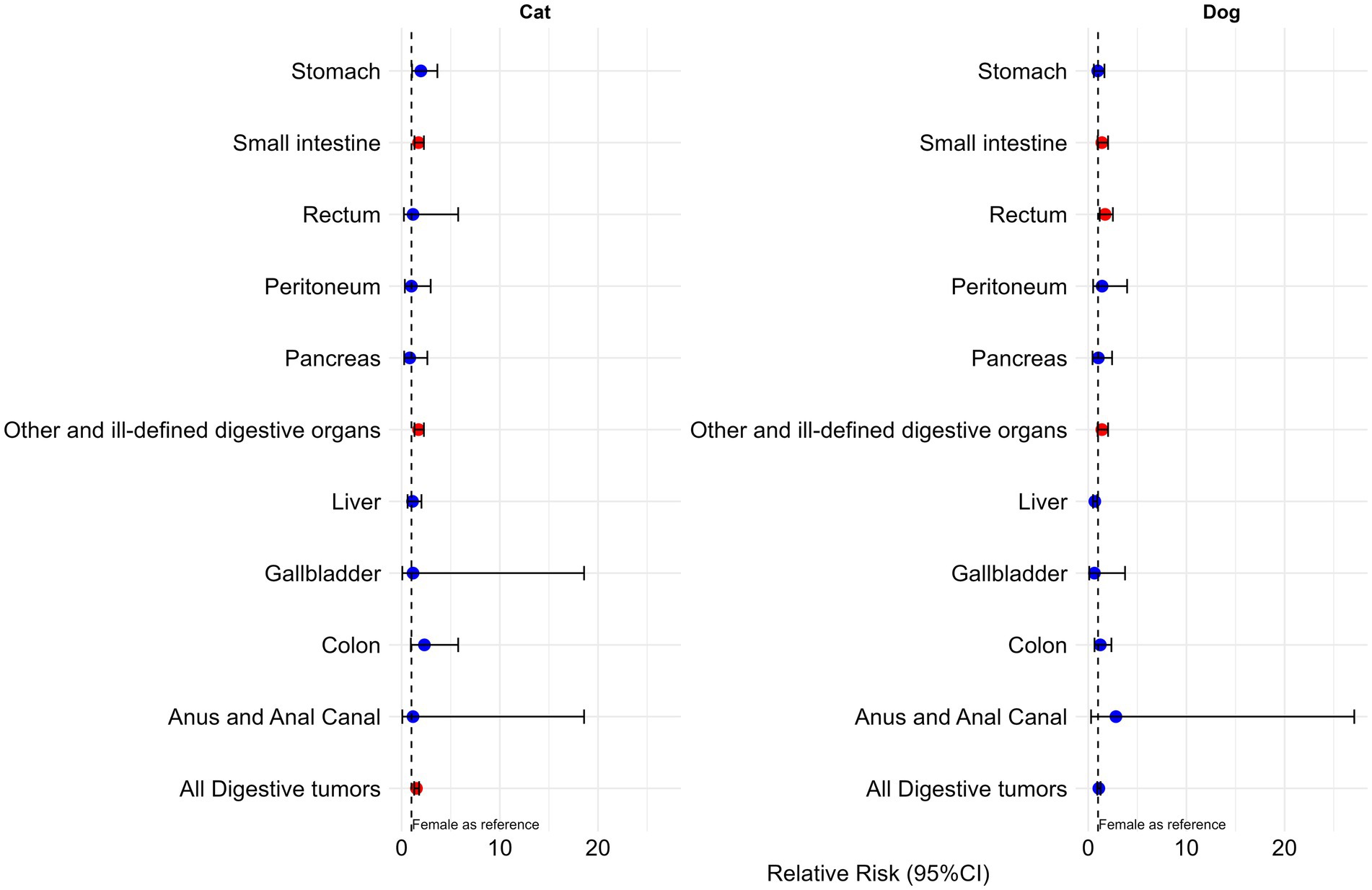 Figure 4. Relative risk and corresponding 95% confidence interval (95%CI) for digestive tumors in males versus female, in cats and dogs.
